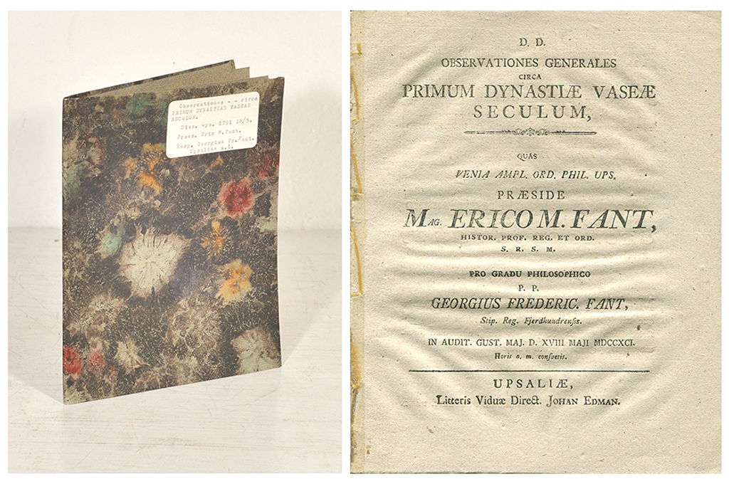Marklin Catalogus disputationum 146. Setterwall Svensk historisk bibliografi 1045. Om Vasadynastins första sekel från Gustav Vasa till Gustav II Adolf. Med en del citat ur svenska samtida skrifter och ett utdrag ur Skogekär Bergbos ”Swenska språkets klagomål”. Georg Fredric Fant (1768-1823) var kusin till Eric Michael Fant (1754-1817).