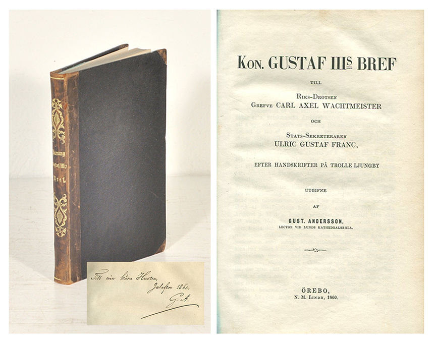 Örebro, N. M. Lindh, 1860. 8:o. IV,151,(1 blank,1) s. Hfrbd med guldornerad rygg. Grönstänkta snitt och gröna glättade för- och eftersättspapper. Något nött rygg. En liten fläck på sista sidan. Dedikation från utgivaren: ”Till min kära hustru, julafton 1860, G. A.” Bra ex.