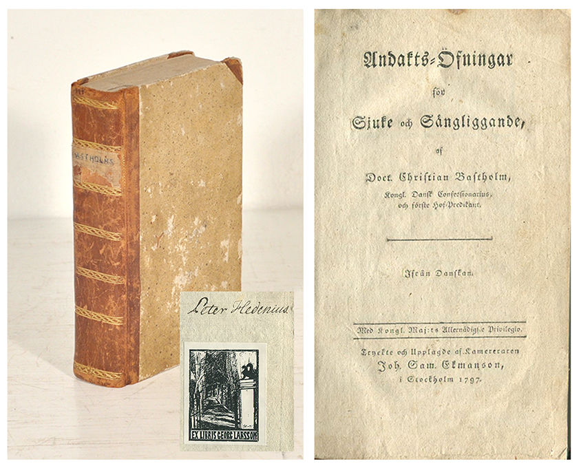 Bibliotheca danica I:448. Originaltiteln är ”Andagts-Ovelser for Syge og Sengeliggende”. Christian Bastholm (1740-1819) var dansk teolog och överhovpredikant. Med förord av J. C. Morell. Originalet ”Andagts-øvelser for syge og sengeliggende” utkom 1785. Sannolikt är den tidigare ägaren boktryckaren i Skara Peter Hedenius (1800-72).