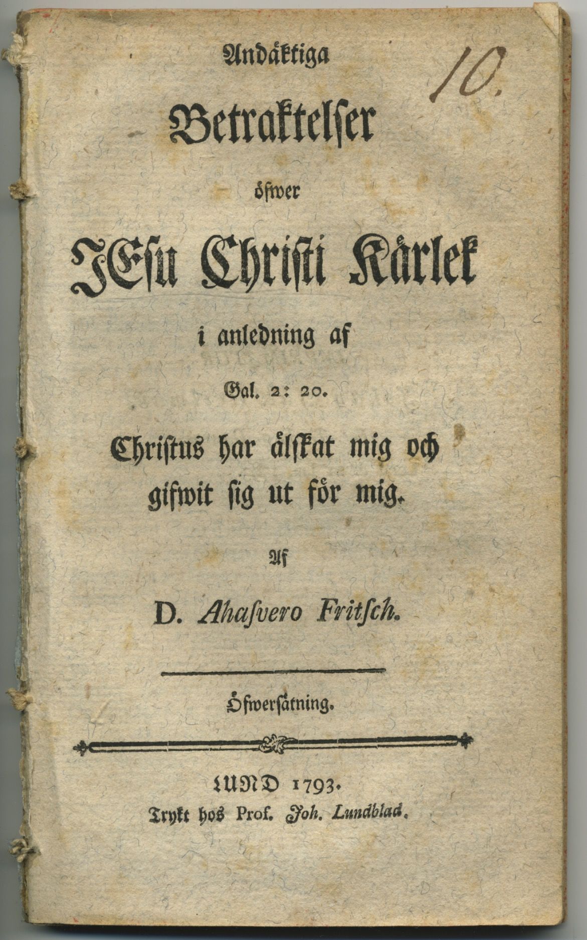 Med ett förord av den tyska utgivaren till den upplaga från 1792 som ligger till grund för denna översättning. Ahasver Fritsch (1629-1701) var konsistorialpresident och kansler i Rudolstadt, Thüringen. Han verkade även som universitetslärare. Han finns representerad i de svenska psalmböckerna från 1695 till 1937 med originaltexten till minst ett verk (nr 122) ”Mein Herr Jesu mich erfreut”, på svenska första gången publicerad i Jakob Arrhenius ”Psalme-profwer” 1691. Många olika av hans teologiska skrifter översattes till svenska från 1689 och han fortsatte att vara populär till långt in på 1800-talet.