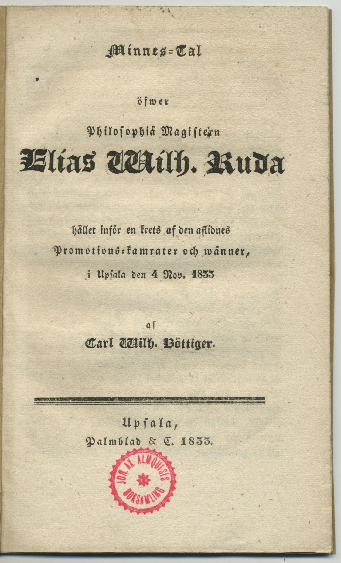 Minnes-tal öfwer philosophiä magistern Elias Wilh. Ruda hållet inför en krets af den aflidnes promotions-kamrater och wänner, i Upsala den 4 november 1833.
