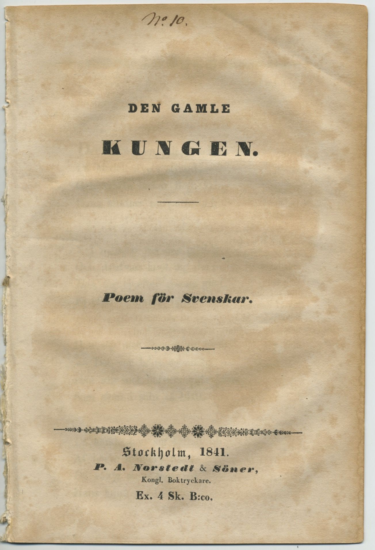 Sthlm, P. A. Norstedt & söner, 1841. 8:o. 8 s. Tagen ur band. Ganska bruntonad och lagerfläckig. Samtida numrering upptill på titelbladet: ”No. 10.”
