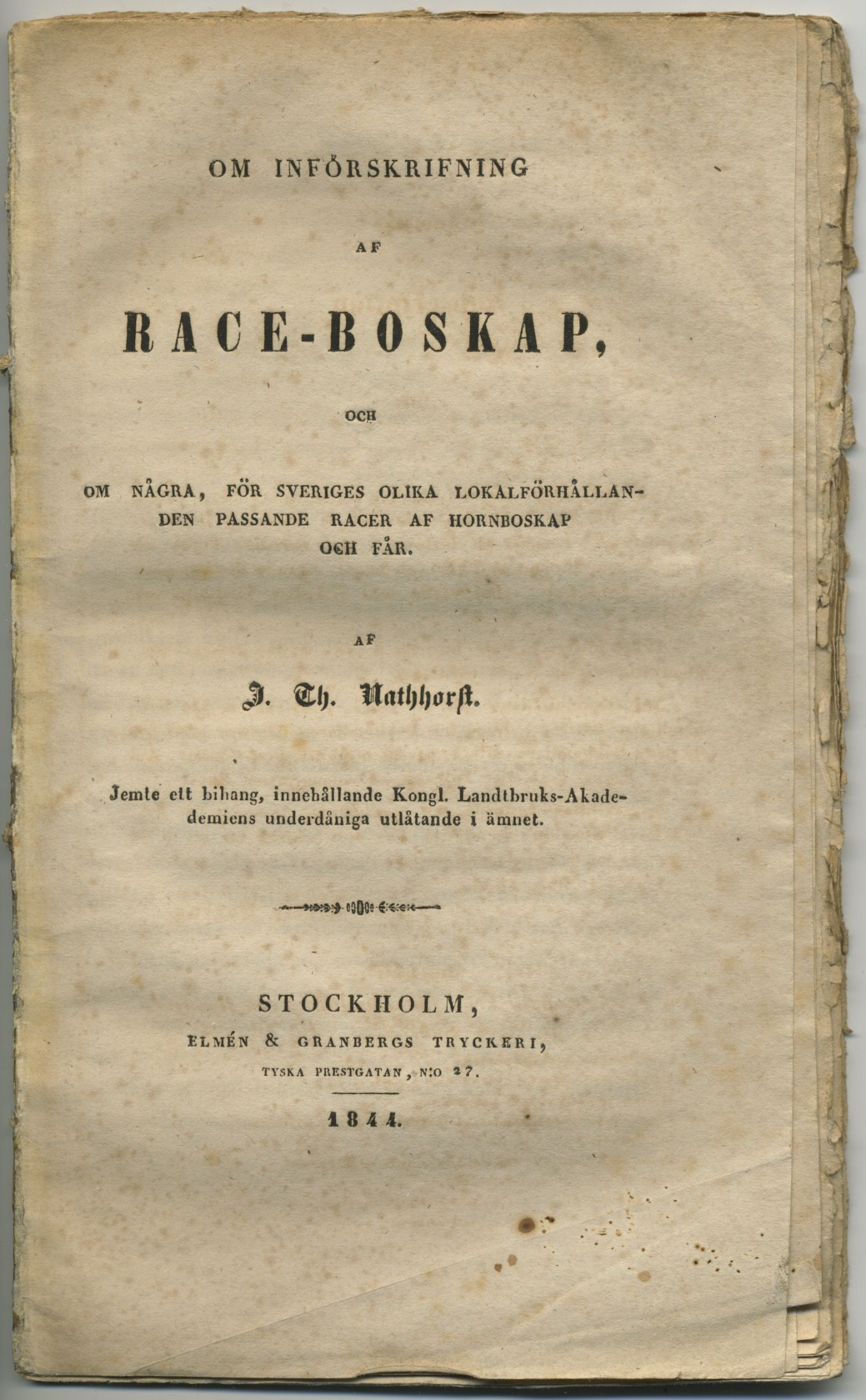 Om införskrifning af race-boskap, och om några, för Sveriges olika lokalförhållanden passande racer af hornboskap och får. Jemte ett bihang, innehållande kongl. Landtbruks-akademiens underdåniga utlåtande i ämnet.