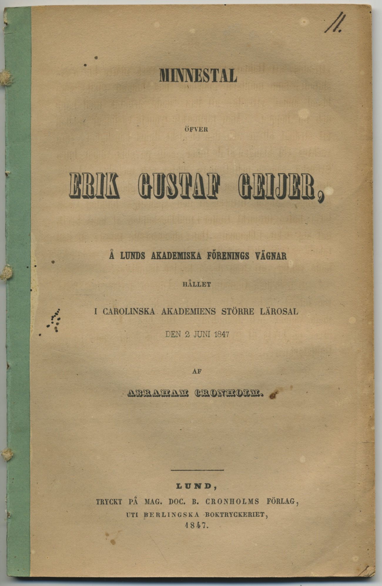 Minnestal öfver Erik Gustaf Geijer, å Lunds akademiska förenings vägnar hållet i Carolinska akademiens större lärosal den 2 juni 1847.