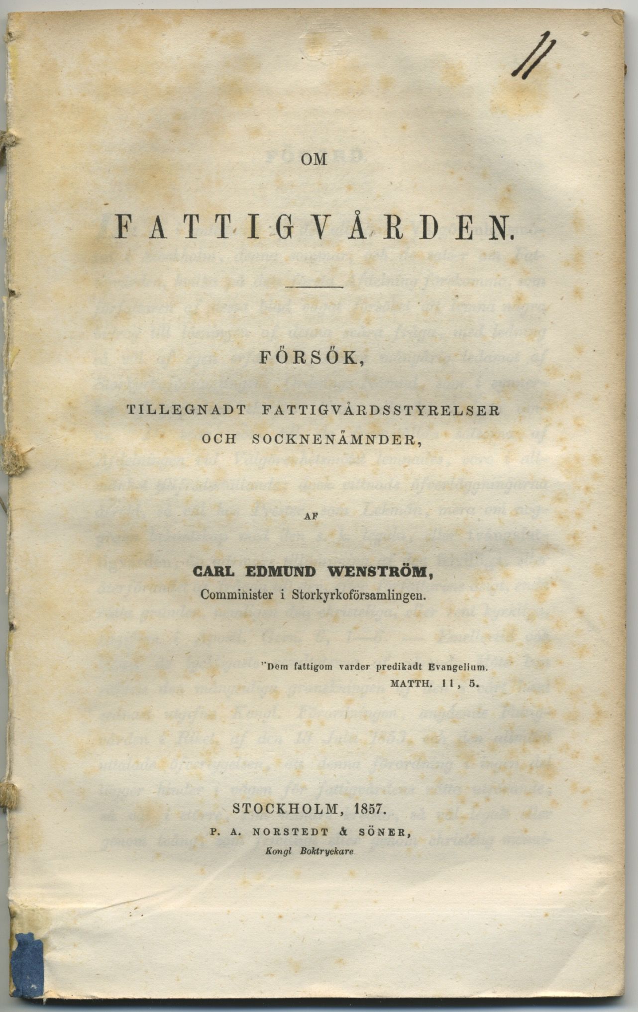 Sthlm, P. A. Norstedt & söner, 1857. 8:o. 73,(1) s. Tagen ur band. Gamla stänkta snitt. Det inledande och avslutande bladet lite lagerfläckiga. Titelbladet med samtida numrering upptill: ”11”.