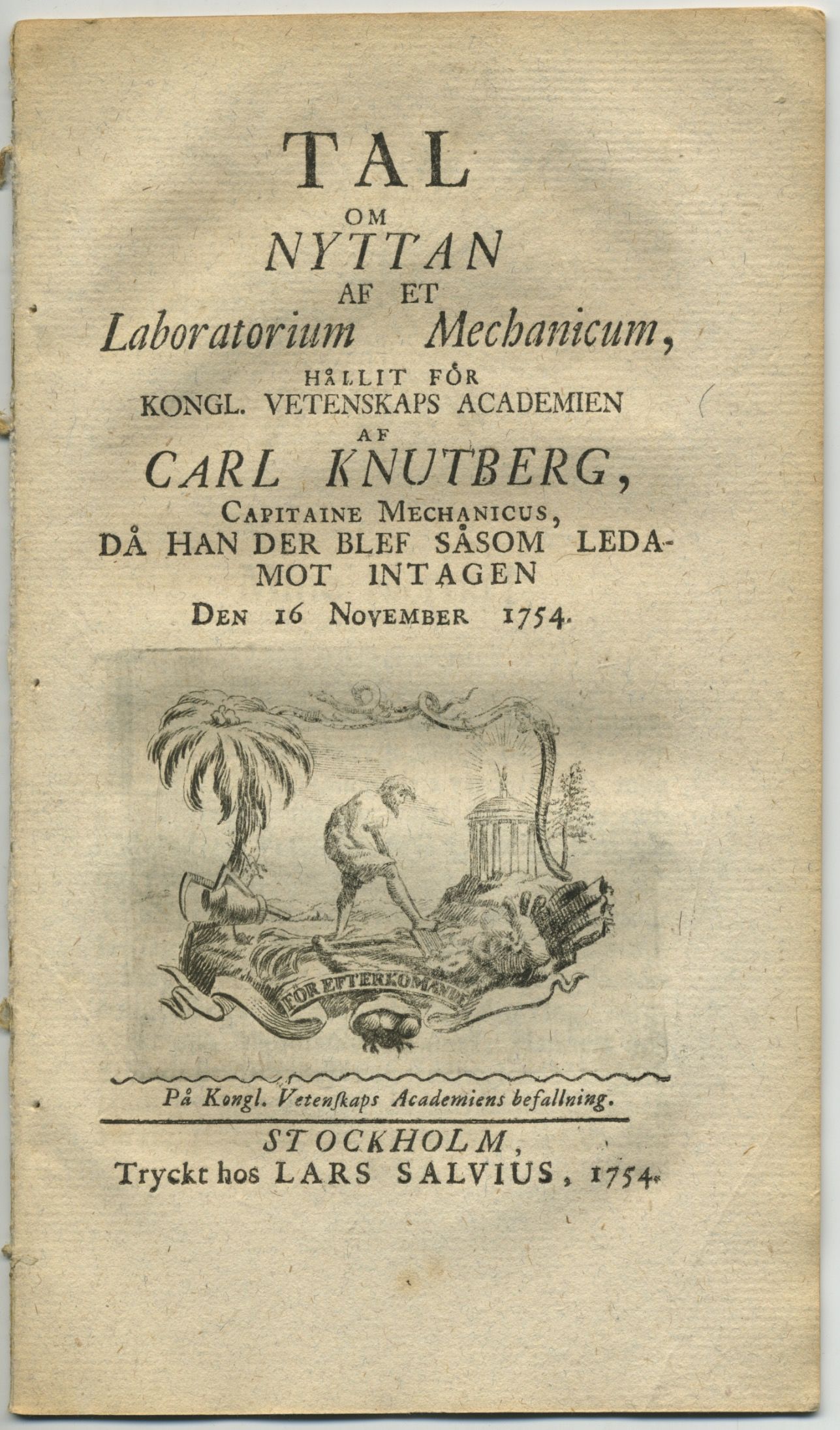 Tal om nyttan af et laboratorium mechanicum, hållit för kongl. Vetenskaps academien [...] då han der blef såsom ledamot intagen den 16 november 1754.