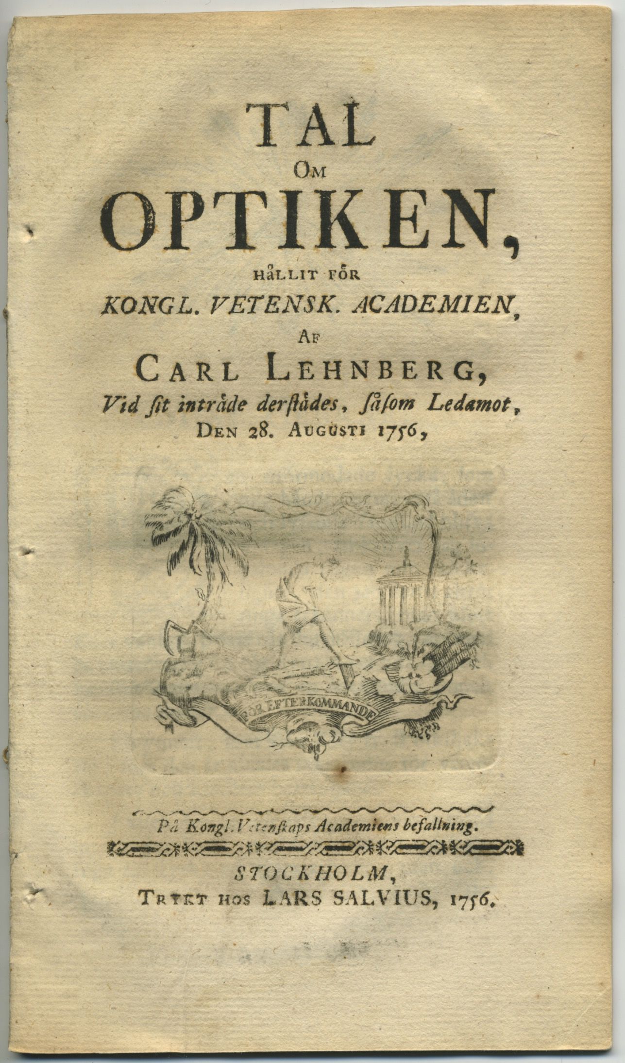 Svarstalet av Mårten Strömer. Carl Lehnberg (1725-68) var optisk instrumentmakare och hade som student i Uppsala undervisats av Klingenstierna i den optiska glasslipningens teori och praktik och sedan under en tvåårig studieresa genom Europa tagit del av tillverkningsmetoder och yrkeshemligheter. Han invaldes i Vetenskapsakademien där han tog inträde med detta tal 1756. Hans presidietal 1762 avhandlade också optiken. I sin verkstad, inrymd på Kungl. myntet, tillverkade han objektiv- och okulärglas för astronomerna, bland annat de första akromatiska linserna i Sverige. Men han dog i förtid och den optiska verkstaden nådde under hans efterföljare aldrig samma nivå.