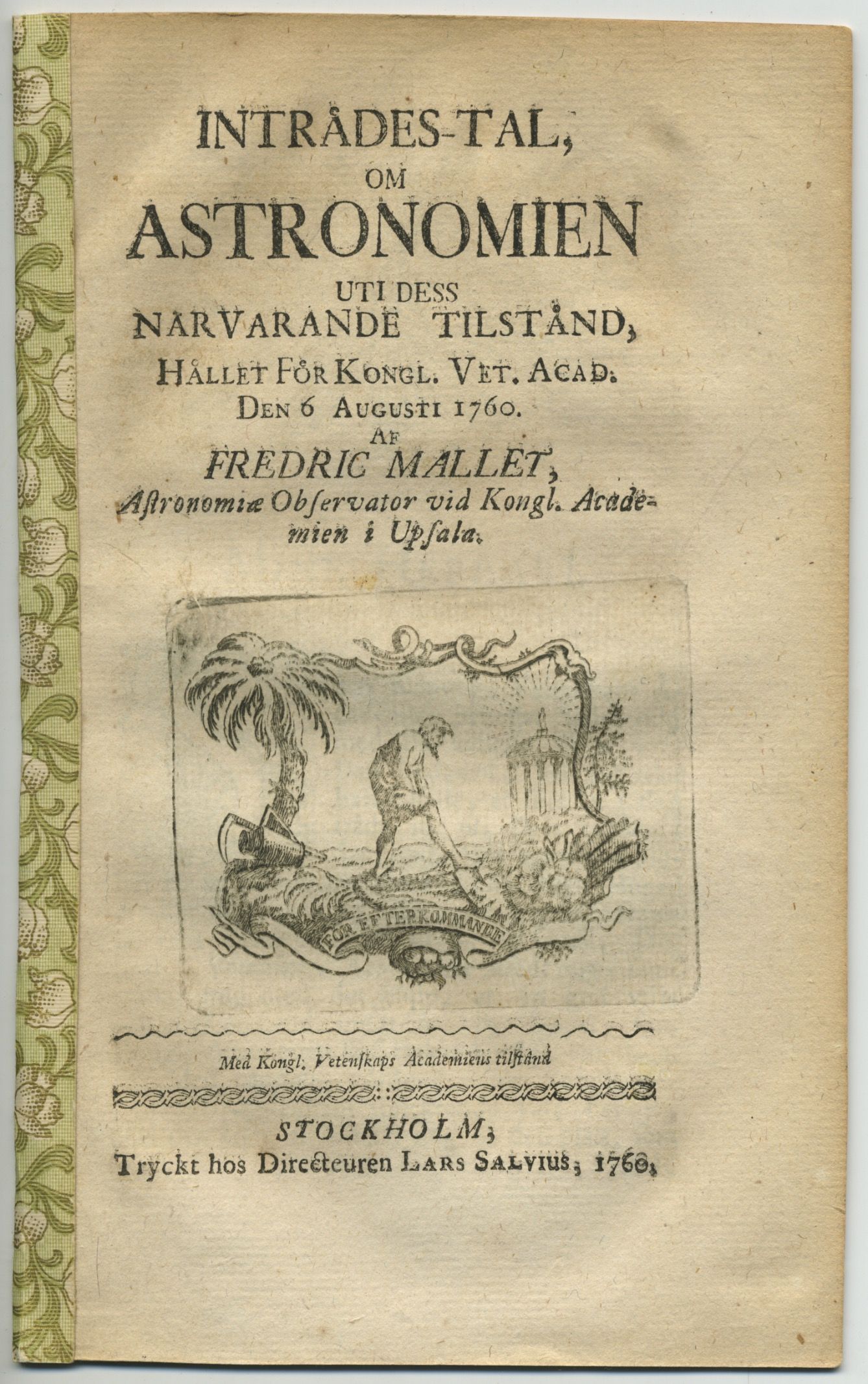Svarstalet hölls av akademiens preses Gabriel Polhem. Fredrik Mallet (1728-97) var egentligen mer matematiker än astronom. Efter hemkomsten från en studieresa i England, som i hög grad ägnades åt det astronomiska instrumentmakeriet, blev han kallad till astronomie observator vid Uppsala universitet.