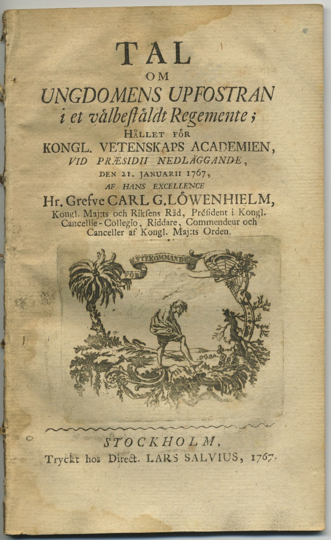 Tal om ungdomens upfostran i et välbestäldt regemente; hållet för kongl. Vetenskaps academien, vid præsidii nedläggande, den 21 januarii 1767.
