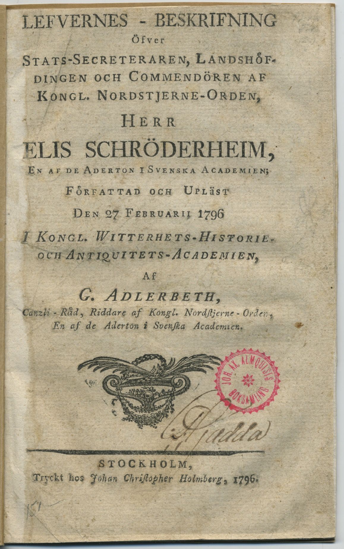 Lefvernes-beskrifning öfver stats-secreteraren, landshöfdingen och commendören af kongl. Nordstjerne-orden, herr Elis Schröderheim, en af de aderton i Svenska academien; författad och upläst den 27 februarii 1796 i kongl. Witterhets- historie- och antiquitets-academien.