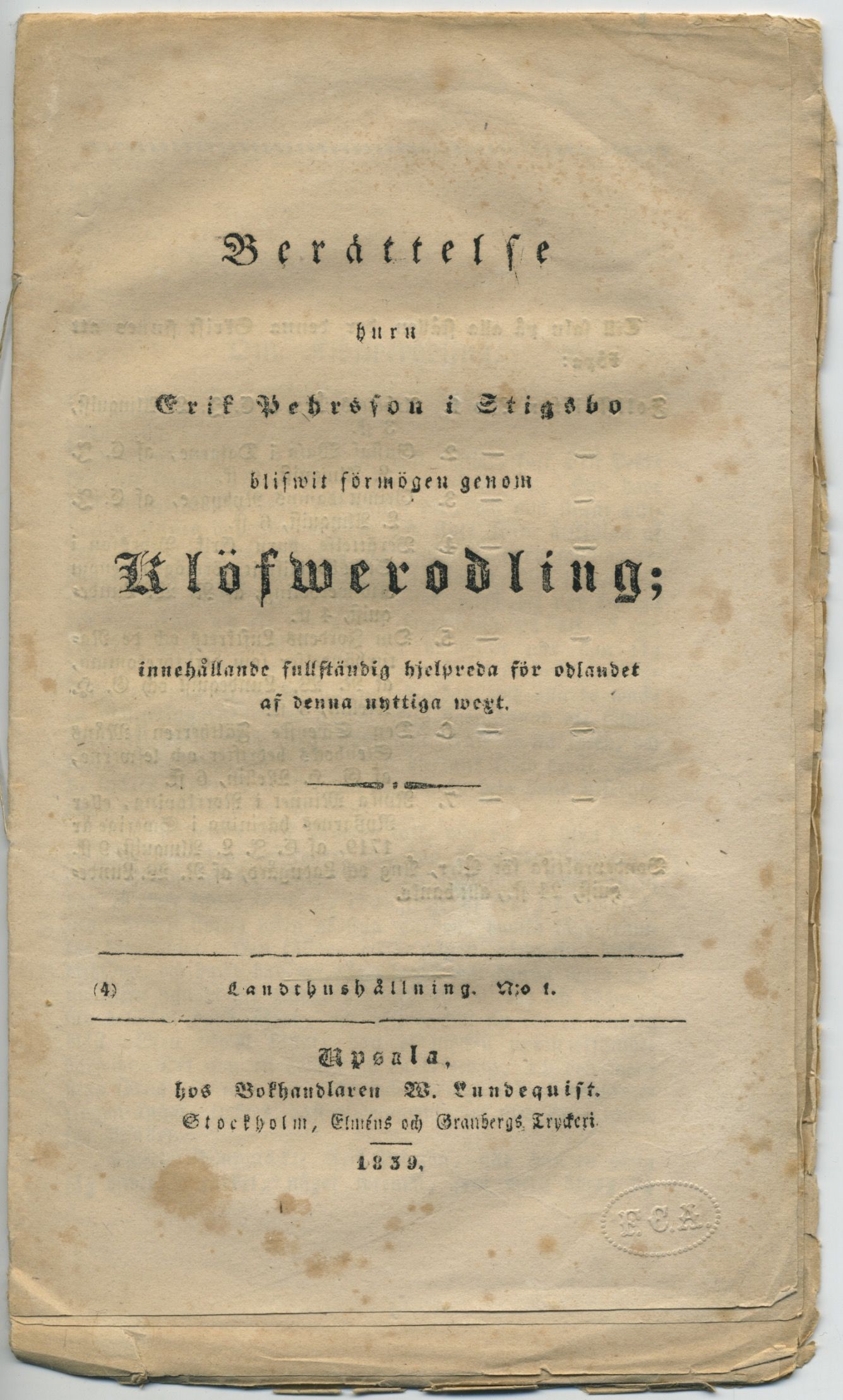 Berättelse huru Erik Pehrsson i Stigsbo blifwit förmögen genom klöfwerodling; innehållande fullständig hjelpreda för odlandet af denna nyttiga wext.