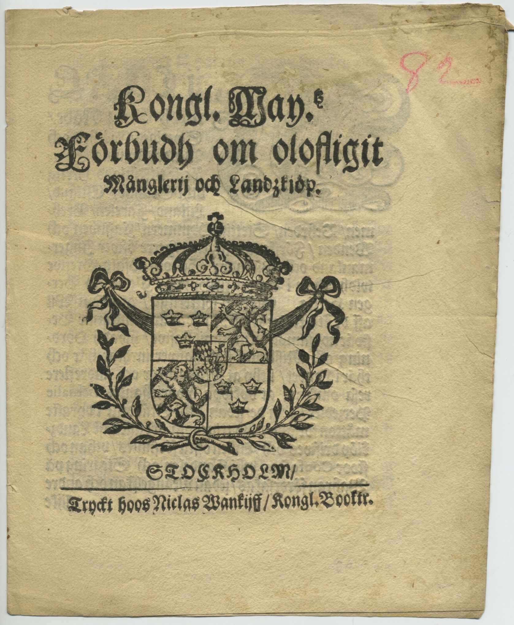 Kongl. may.tz förbudh om olofligit månglerij och landzkiöp.