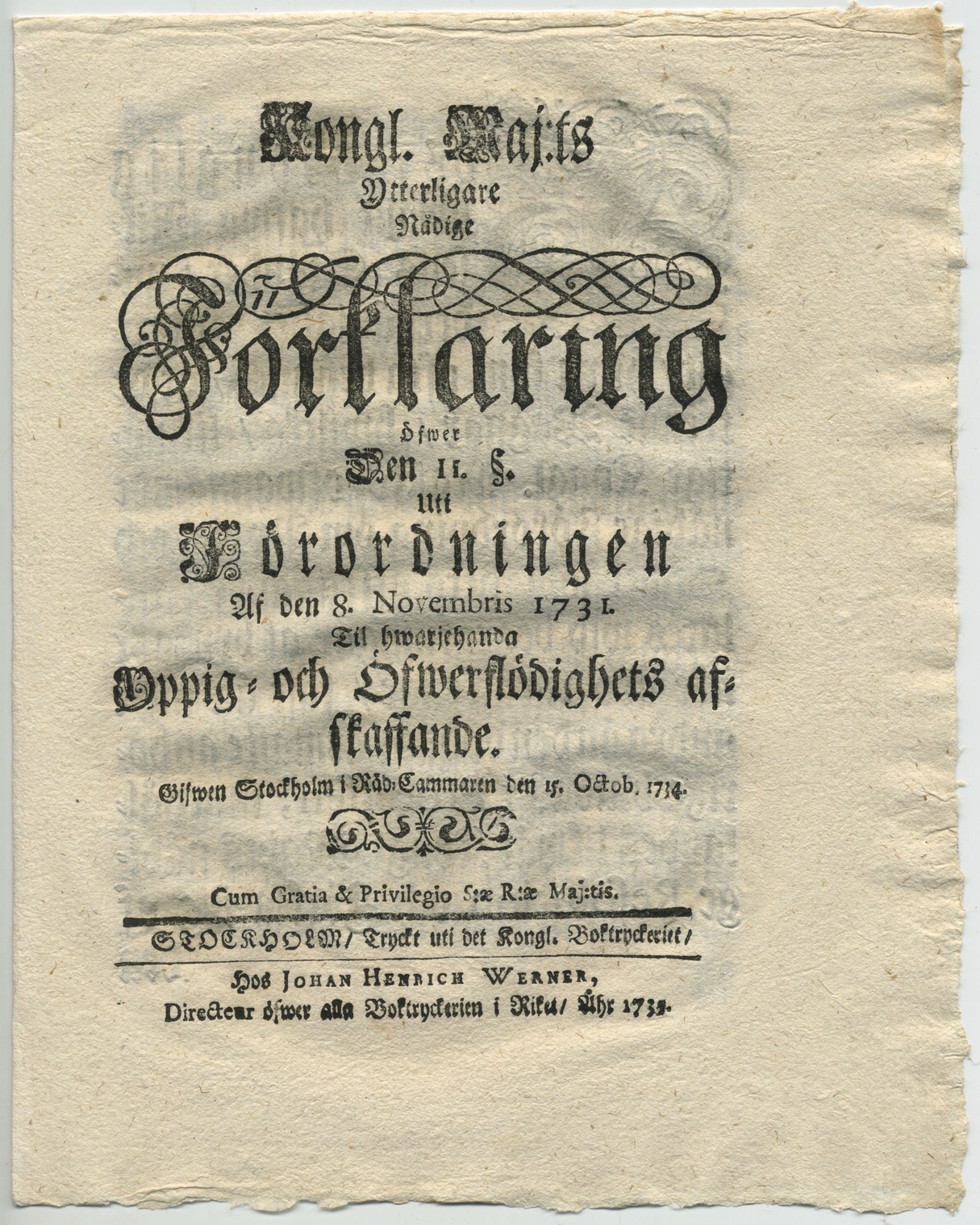 Kongl. maj:ts yttterligare nådige förklaring öfwer den 11 §. uti förordningen af den 8 novembris 1731 til hwarjehanda yppig- och öfwerflödighets afskaffande. Gifwen Stockholm i råd-cammaren den 15 octob. 1734.