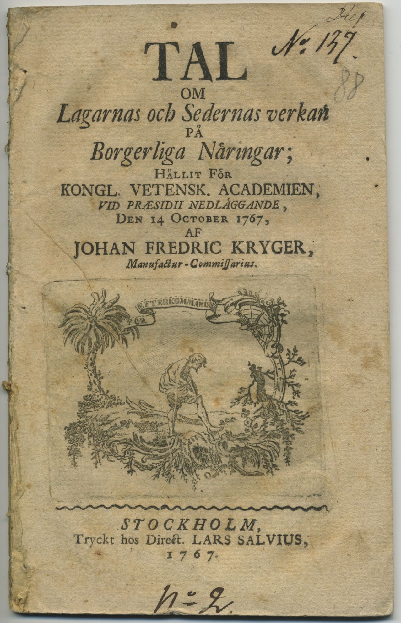 Tal om lagarnas och sedernas verkan på borgerliga näringar; hållit för kongl. Vetensk. academien, vid præsidii nedläggande, den 14 october 1767.
