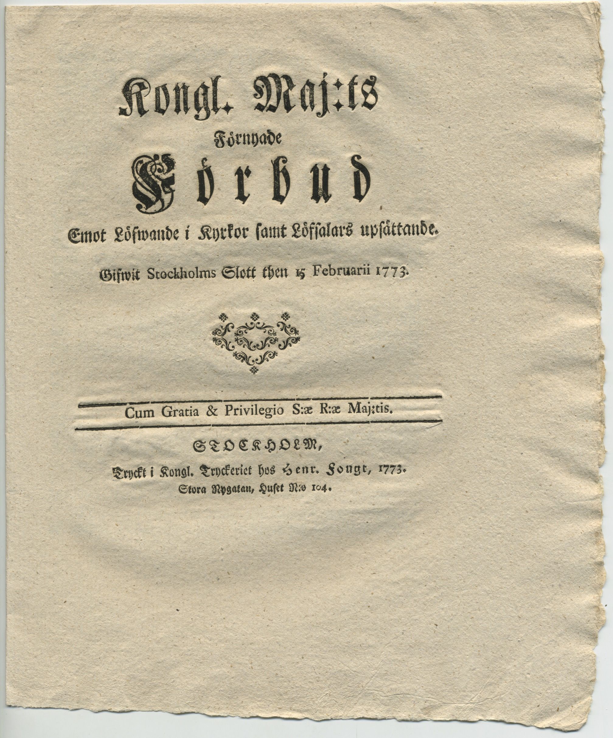 Kongl. maj:ts förnyade förbud emot löfwande i kyrkor samt löfsalars upsättande. Gifwit Stockholms slott then 15 februarii 1773.