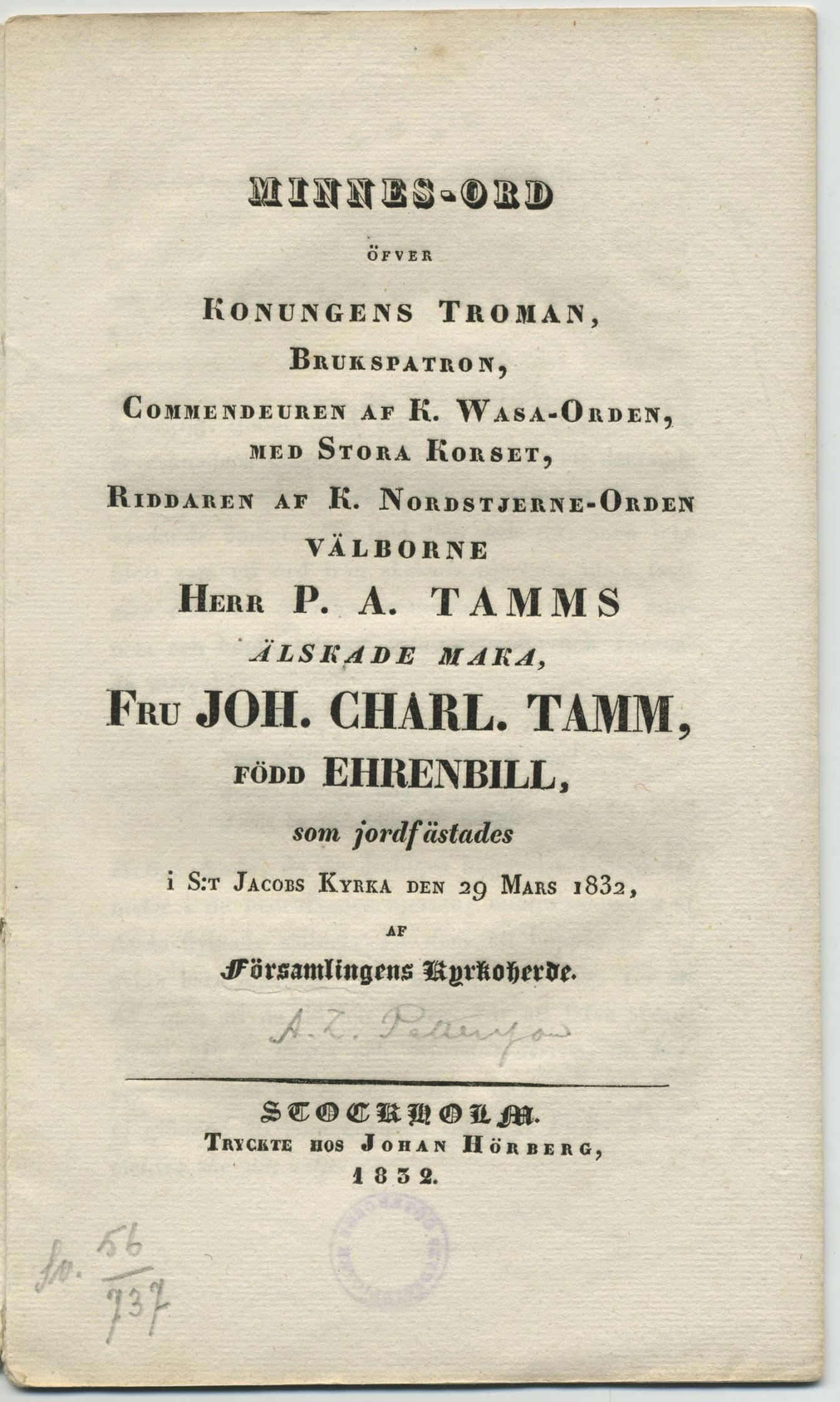 Minnes-ord öfver konungens troman, brukspatron, commendeuren af k. Wasa-orden, med stora korset, riddaren af k. Nordstjerne-orden välborne herr P. A. Tamms älskade maka, fru Joh. Charl. Tamm, född Ehrenbill, som jordfästades i S:t Jacobs kyrka den 29 mars 1832, af församlingens kyrkoherde.