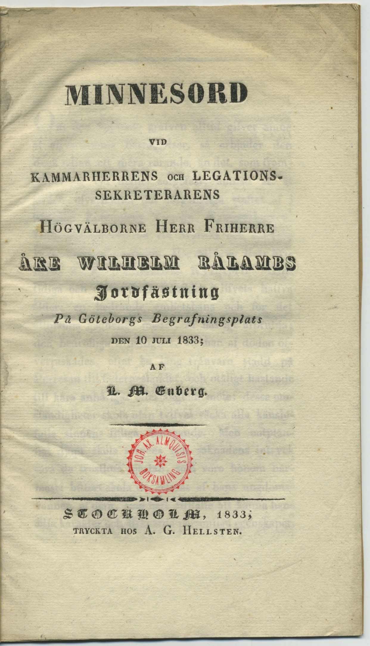 Minnesord vid kammarherrens och legationssekreterarens högvälborne herr friherre Åke Wilhelm Rålambs jordfästning på Göteborgs begrafningsplats den 10 juli 1833.