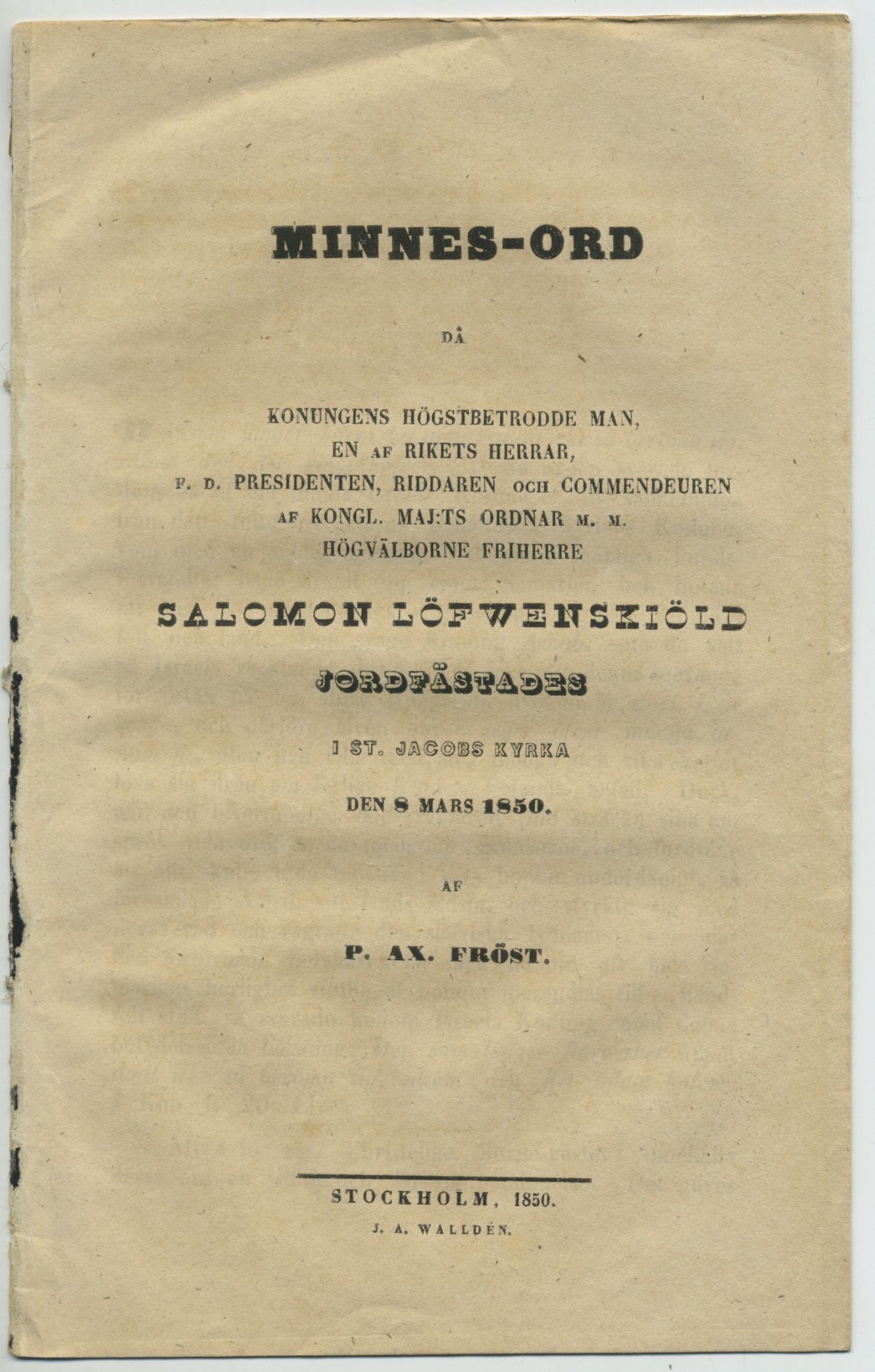Minnes-ord då konungens högstbetrodde man, en af rikets herrar, f.d. presidenten, riddaren och commendeuren af kongl. maj:ts ordnar m.m. högvälborne friherre Salomon Löfwenskiöld jordfästades i St. Jakobs kyrka den 8 mars 1850.