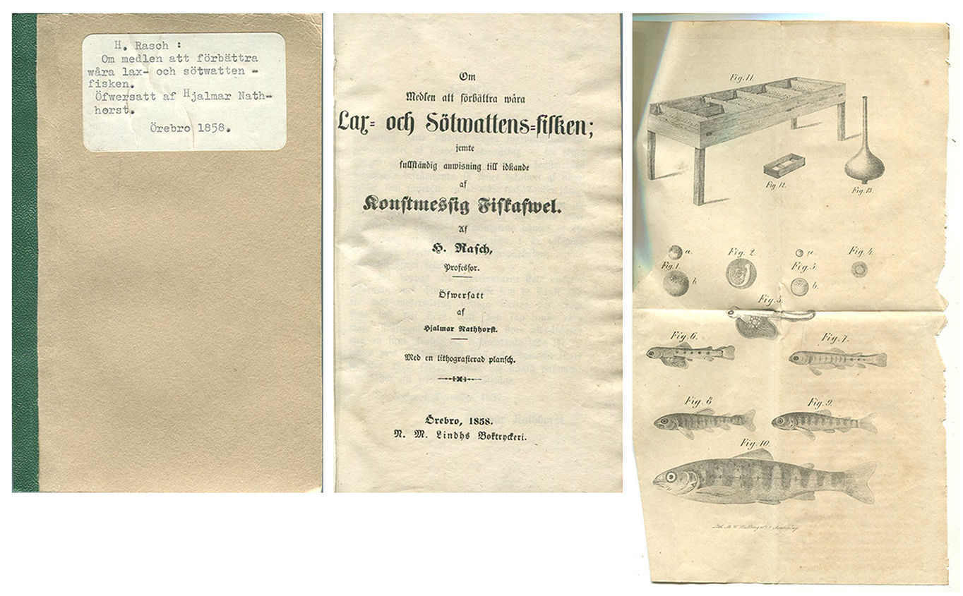 Om medlen att förbättra wåra lax- och sötwattens-fisken; jemte fullständig anwisning till idkande af konstmessig fiskafwel. Öfwersatt af Hjalmar Nathhorst. Med en lithografierad plansch.