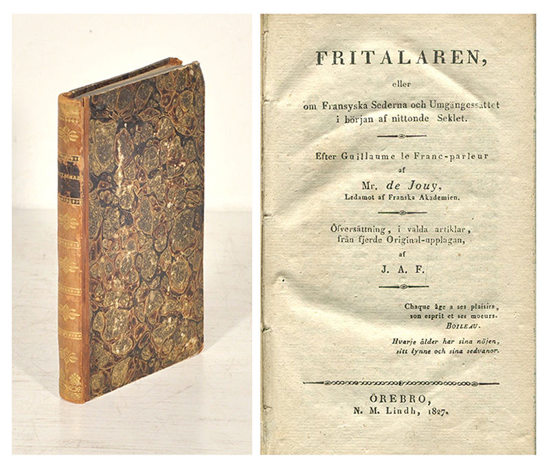 Fritalaren, eller om fransyska sederna och umgängessättet i början af nittonde seklet. Efter Guillaume le franc-parleur af mr. de Jouy. Öfversättning, i valda artiklar, från fjerde original-upplagan, af J. A. F.