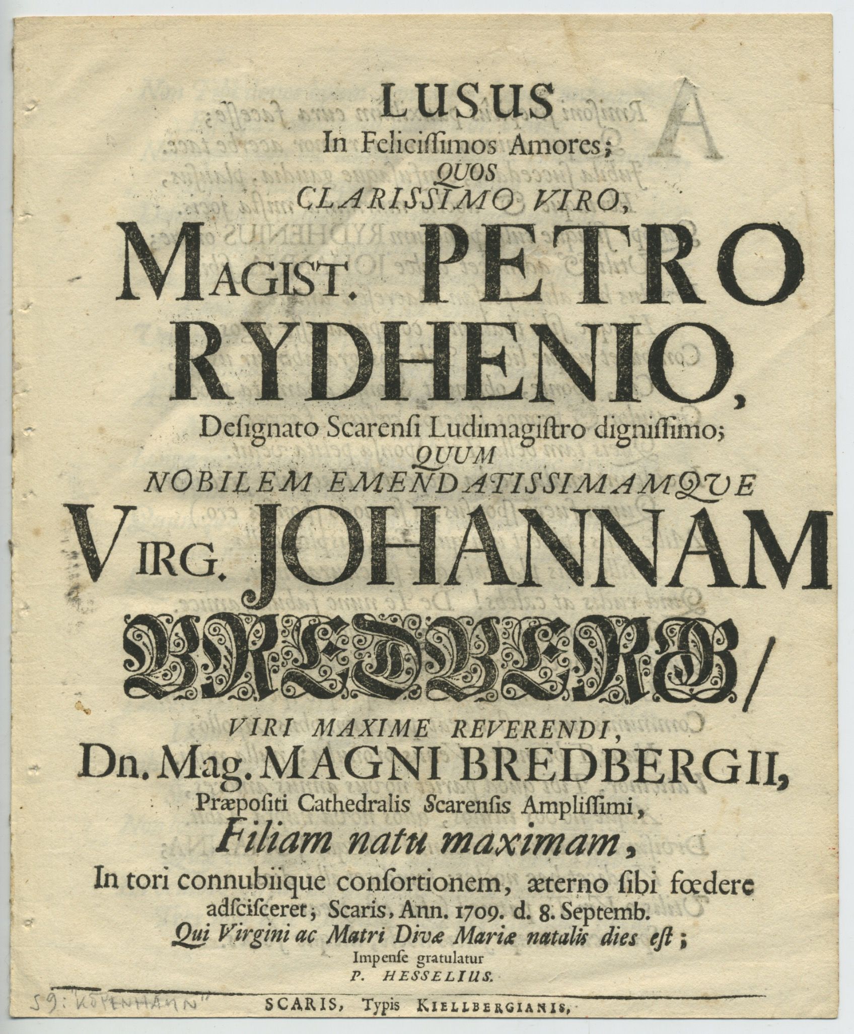 Lusus in felicissimos amores; quos clarissimo viro, magist. Petro Rydhenio, designato Scarensi ludimagistro dignissimo; quum nobilem emendatissimamque virg. Johannam Bredberg/ viri maxime reverendi dn. mag. Magni Bredbergii, præpositi cathedralis Scarensis amplissimi, filiam natu maximam, in tori connubiique consortionem, æterno sibi fœdere adscisceret, Scaris, ann. 1709 d. 8 septemb. Qui virgini ac Matri Divæ Mariæ natalis dies est; impense gratulatur.