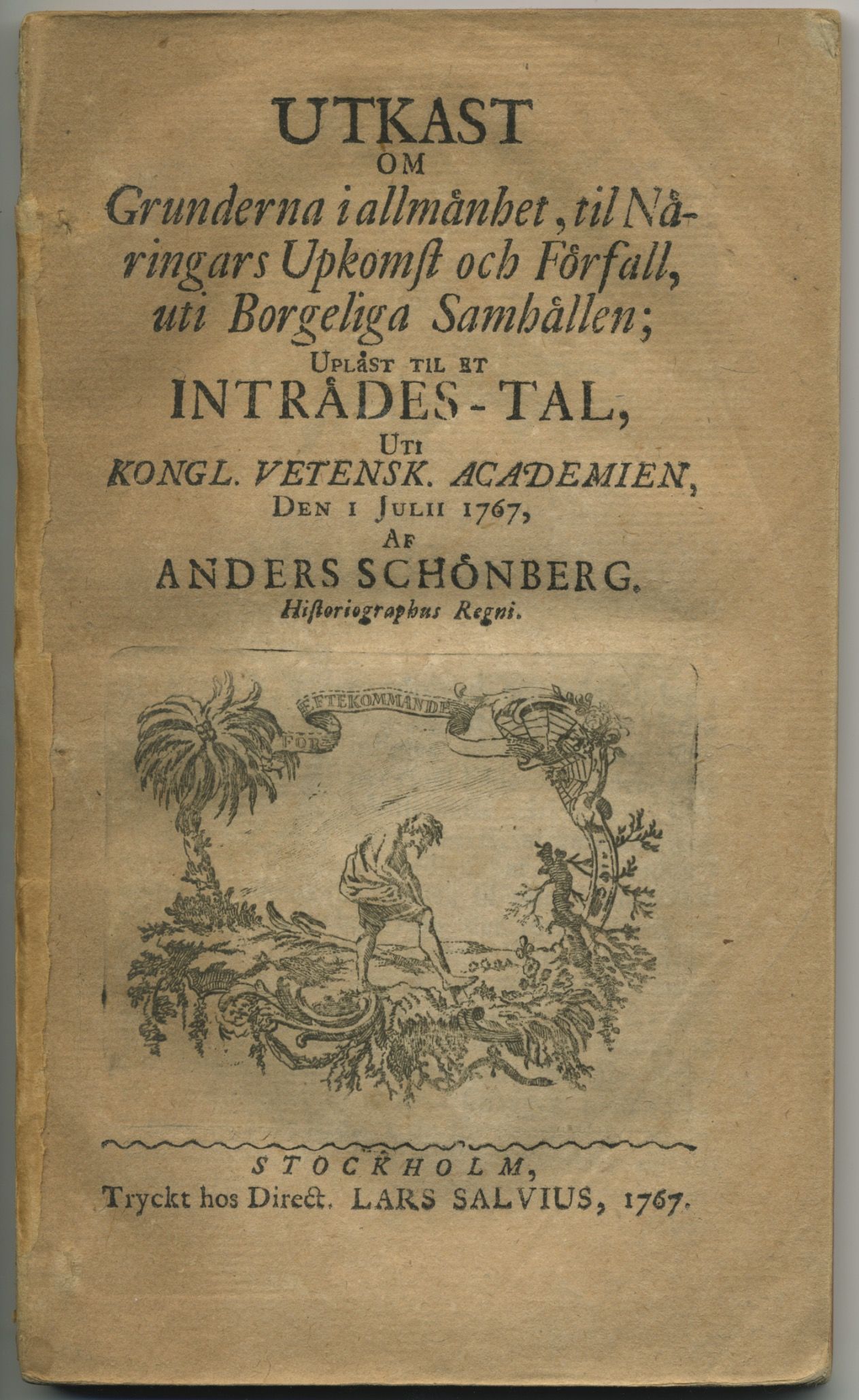 Utkast om grunderna i allmänhet, til näringars upkomst och förfall, uti borgeliga samhällen; upläst til et inträdes-tal, uti kongl. Vetensk. academien, den 1 julii 1767.