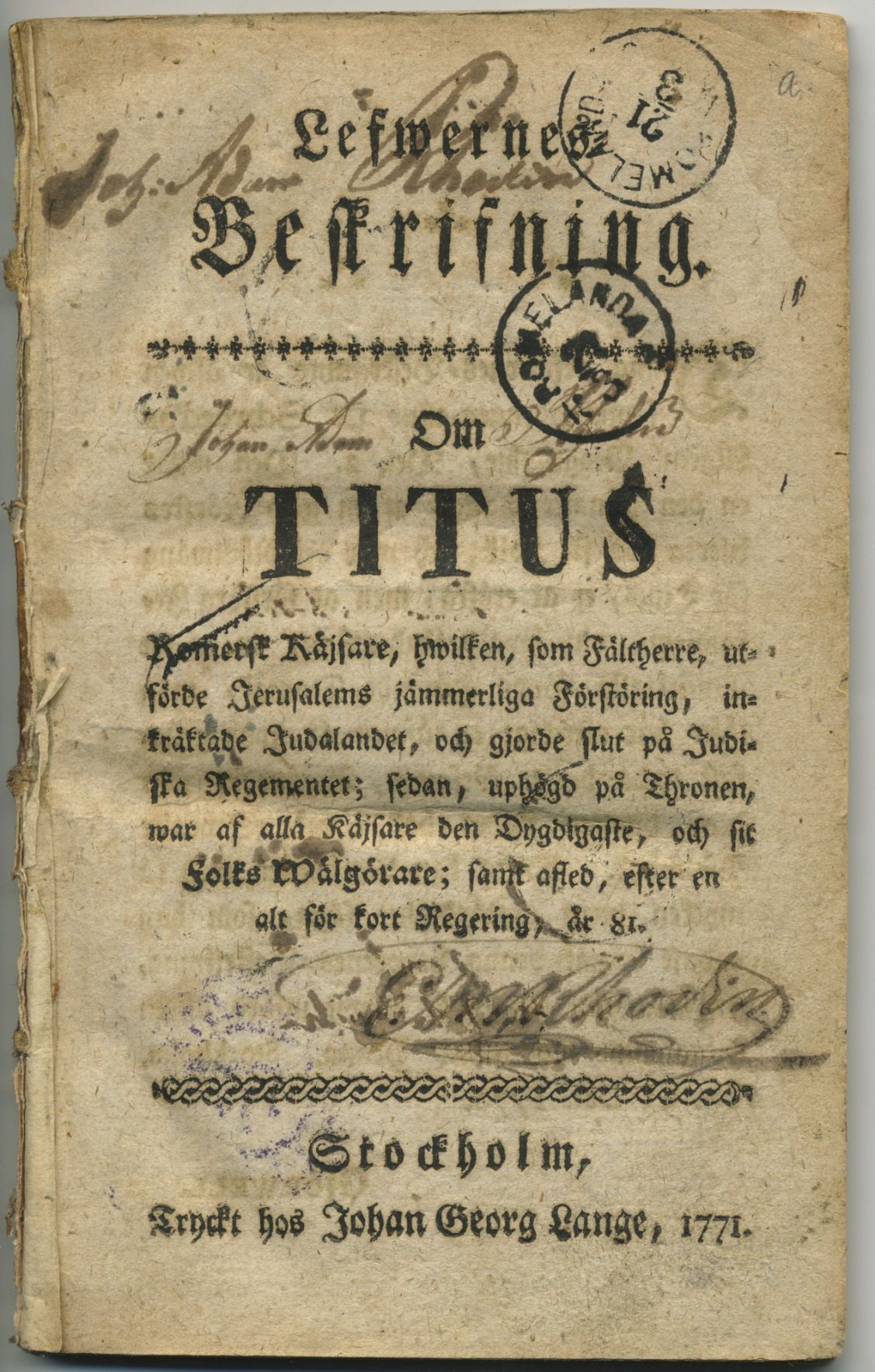 Lefwernes beskrifning. Om Titus romersk käjsare, hwilken, som fältherre, utförde Jerusalems jämmerliga förstöring, inkräktade judalandet, och gjorde slut på judiska regementet; sedan, uphögd på thronen, war af alla käjsare den dygdigaste, och sit folks wälgörare; samt afled, efter en alt för kort regering, år 81.