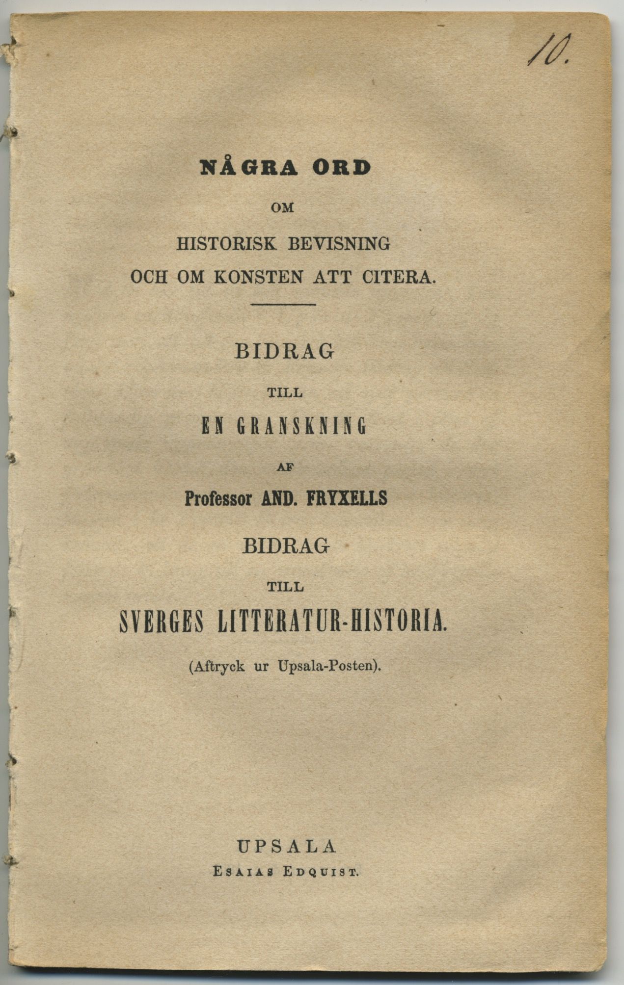 Några ord om historisk bevisning och om konsten att citera. Bidrag till en granskning af professor And. Fryxells Bidrag till Sverges litteratur-historia. (Aftryck ur Upsalaposten).