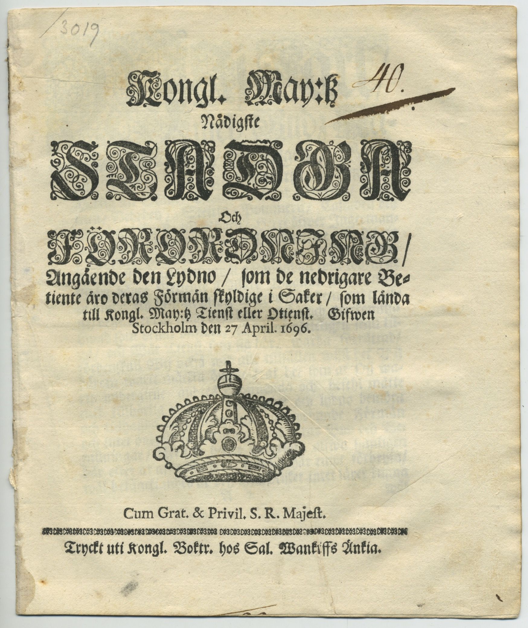 Kongl. may:tz nådigste stadga och förordning/ angående den lydno/ som de nedrigare betiente äro deras förmän skyldige i saker/ som lända till kongl. may:tz tienst eller otienst. Gifwen Stockholm den 27 april 1696.