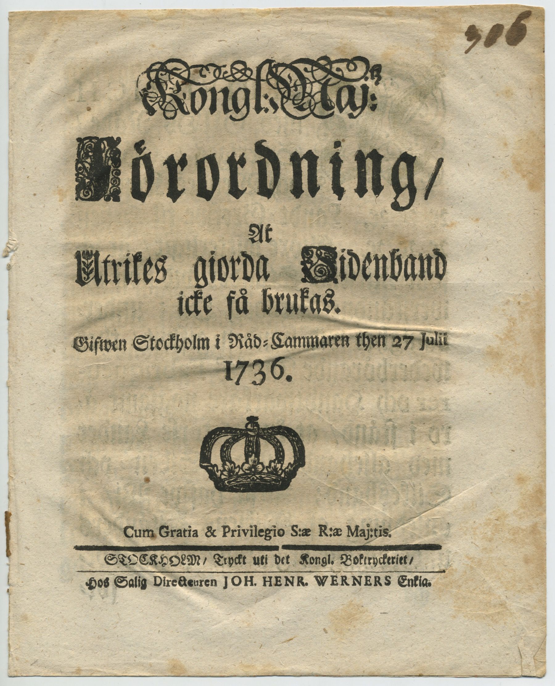 Kongl. maj:tz förordning/ at utrikes giorda sidenband icke få brukas. Gifwen Stockholm i råd-cammaren then 27 julii 1736.