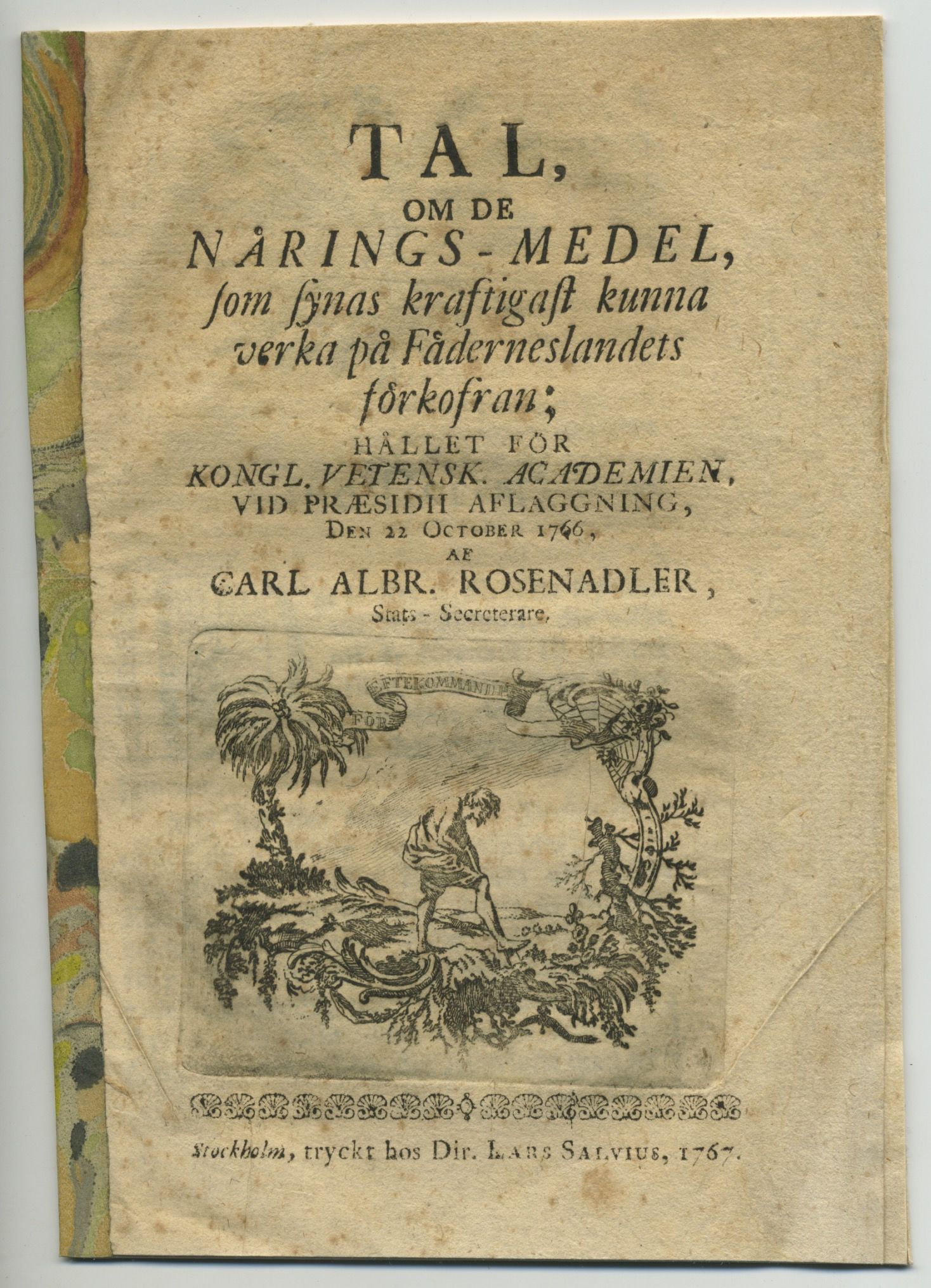Tal, om de närings-medel som synas kraftigast kunna verka på fäderneslandets förkofran; hållet för kongl. Vetenskaps academien, vid præsidii afläggning den 22 october 1766.