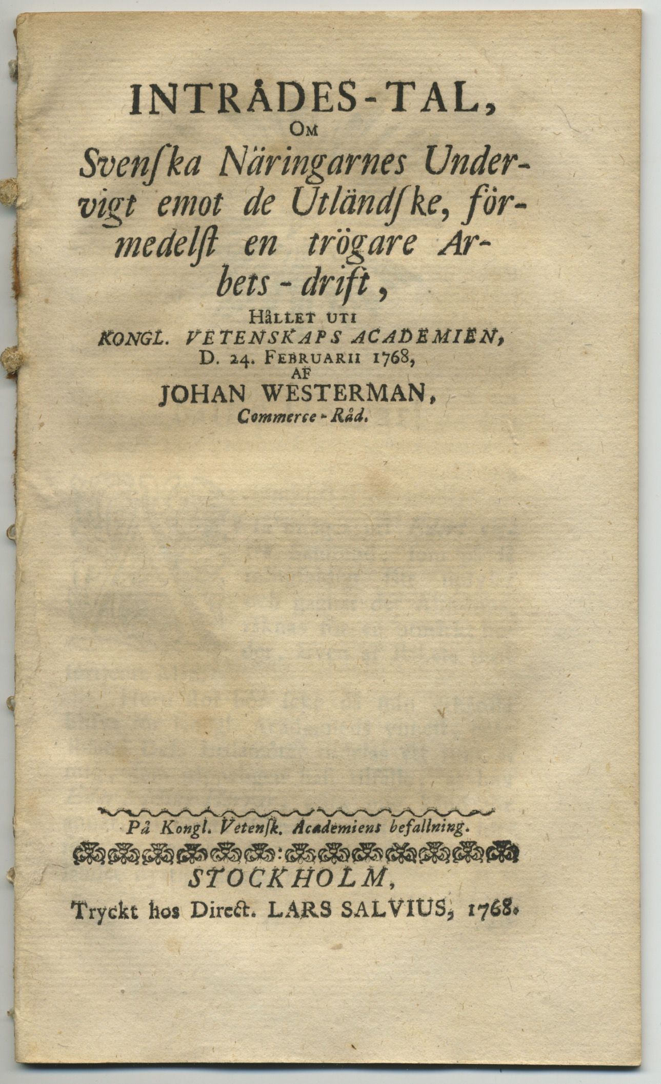 Inträdes-tal, om svenska näringarnes undervigt emot de utländske, förmedelst en trögare arbets-drift, hållet uti kongl. Vetenskaps academien, d. 24 februarii 1768.