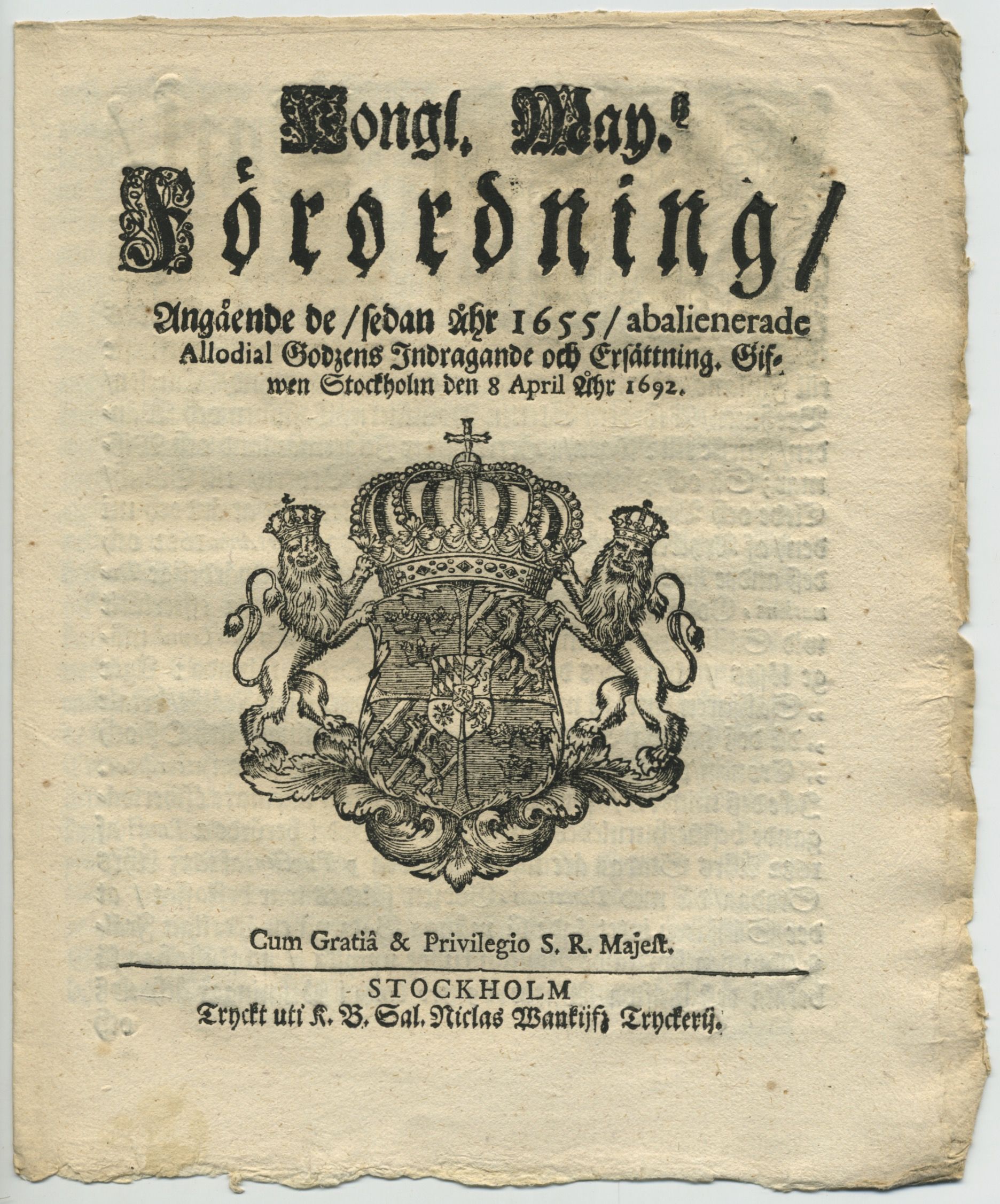 Kongl. may:tz förordning/ angående de/ sedan åhr 1655/ abalienerade allodial godzens indragande och ersättning. Gifwen Stockholm den 8 april, åhr 1692.