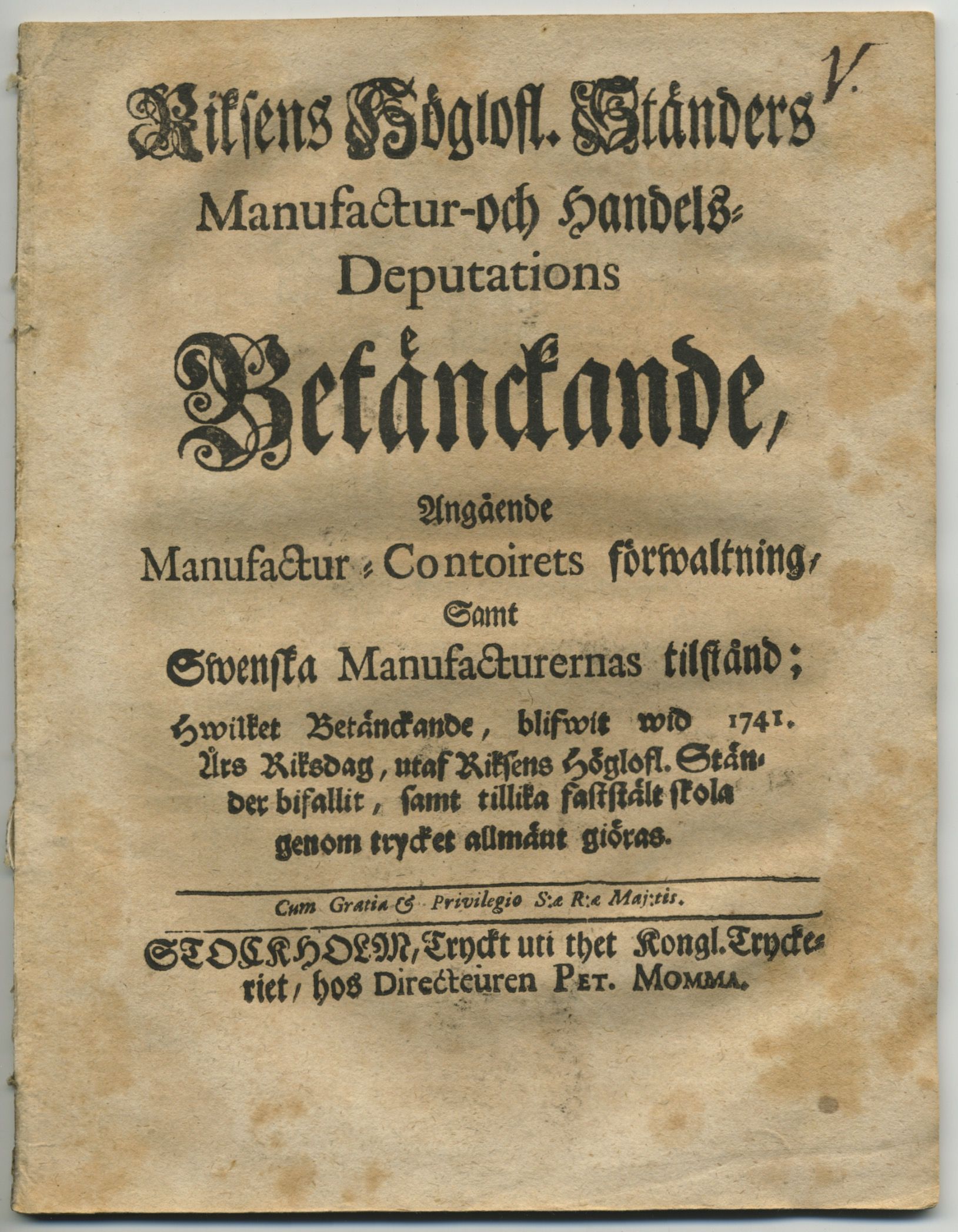 Riksens höglofl. ständers manufactur- och handels-deputations betänckande, angående manufactur-contoirets förwaltning, samt swenska manufacturernas tilstånd; hwilket betänckande, blifwit wid 1741 års riksdag, utaf riksens höglofl. ständer bifallit, samt tillika faststält skola genom trycket allmänt giöras.
