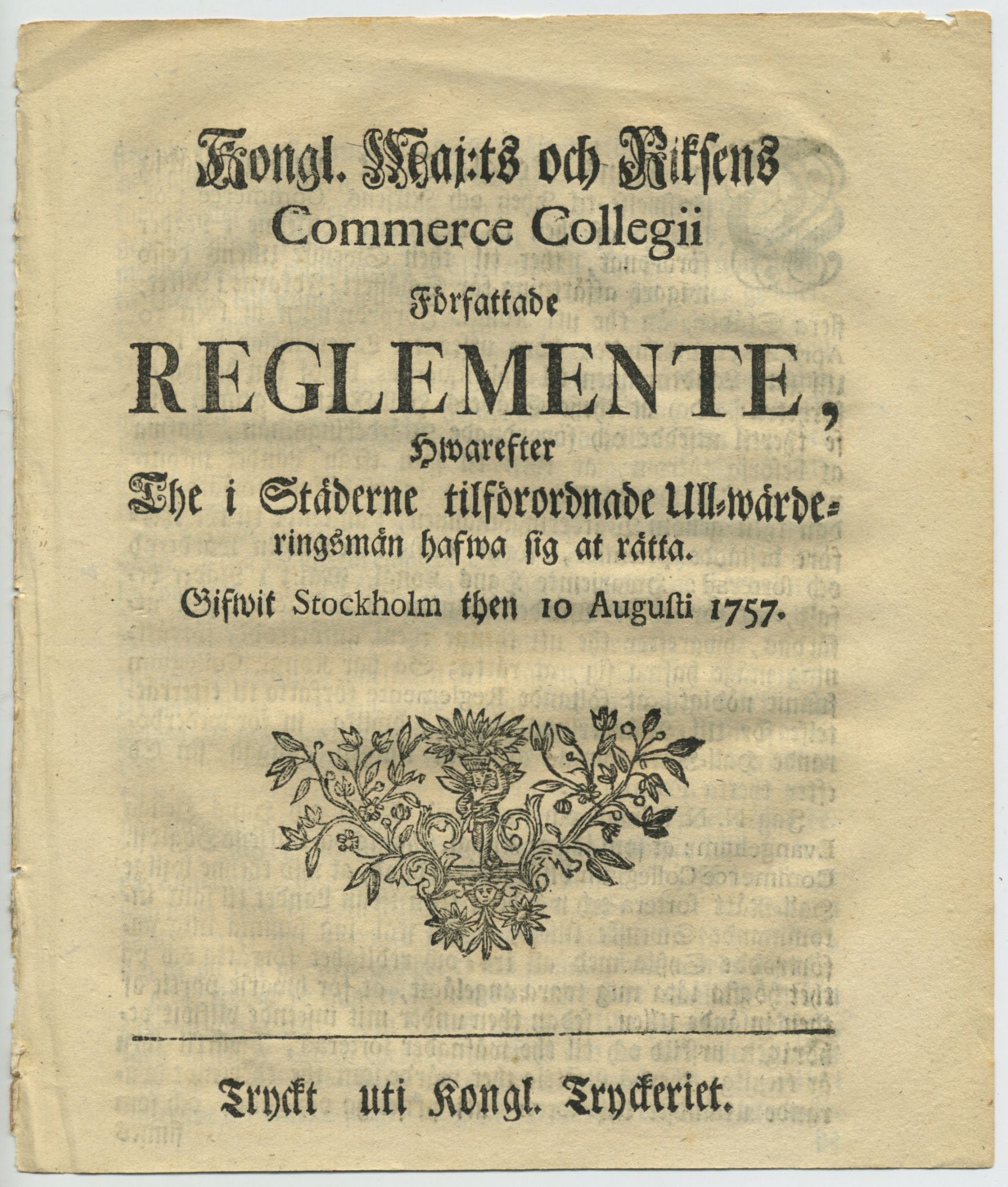 Kongl. maj:ts och riksens Commerce collegii författade reglemente, hwarefter the i städerne tilförordnade ull-wärderingsmän hafwa sig at rätta. Gifwit Stockholm then 10 augusti 1757.