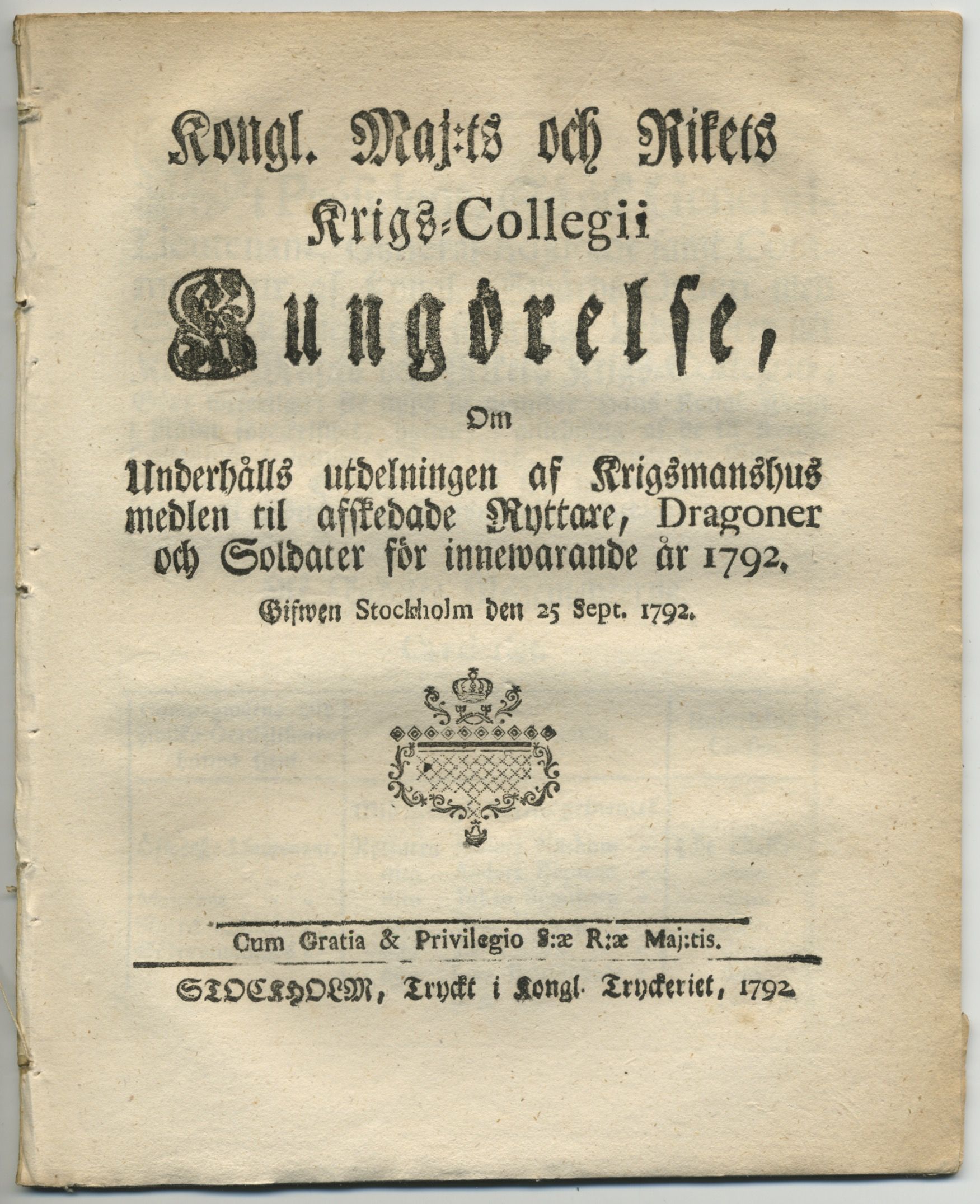 Kongl. maj:ts och rikets Krigs-collegii kungörelse, om underhålls utdelning af krigsmanhus medlen til afskedade ryttare, dragoner och sodater för innewarande år 1792. Gifwen Stockholm den 25 sept. 1792.