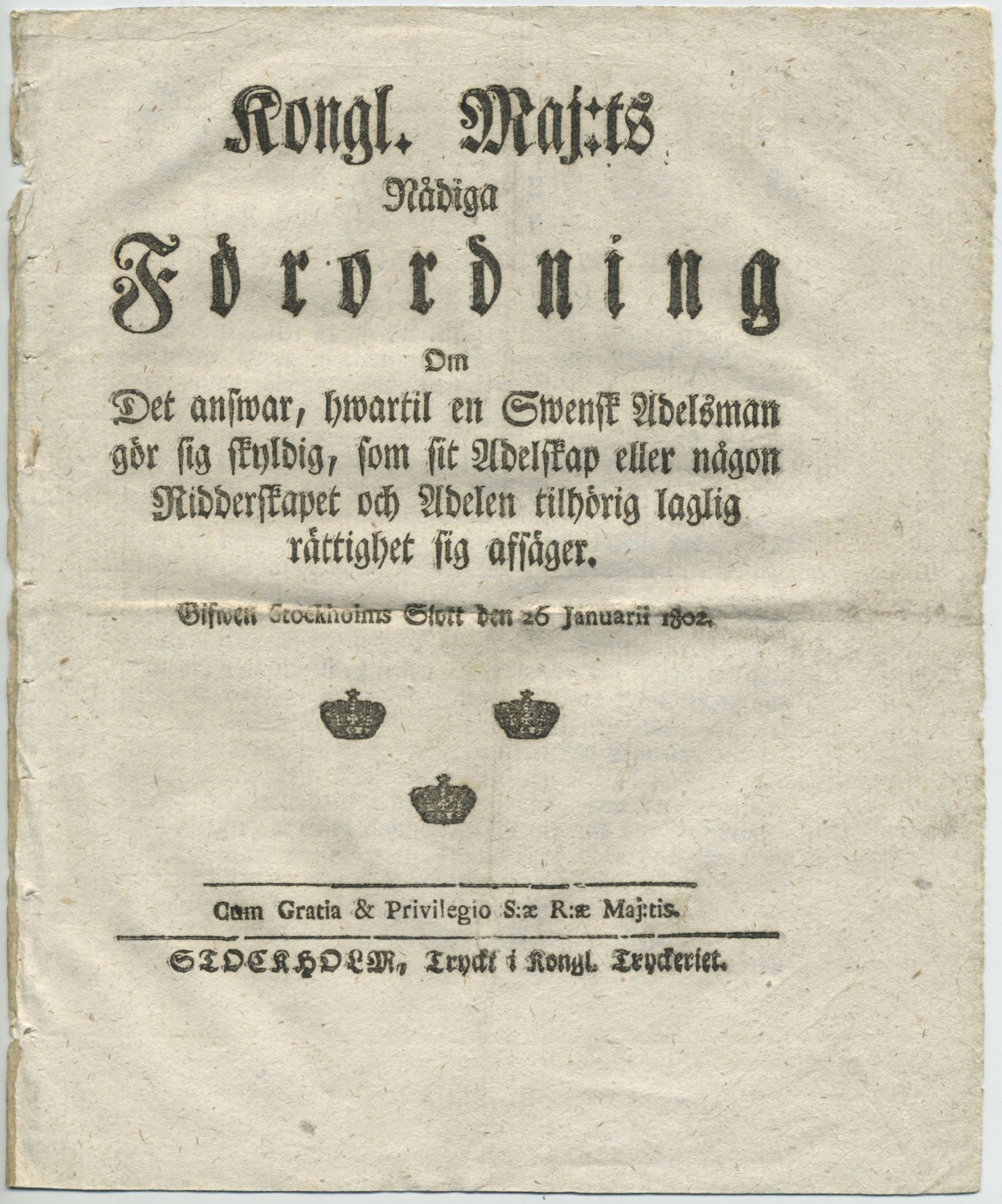 Kongl. maj:ts nådiga förordning om det answar, hwartil en swensk adelsman gör sig skyldig, som sit adelskap eller någon ridderskapet och adelen tilhörig laglig rättighet sig afsäger. Gifwen Stockholms slott den 26 januarii 1802.