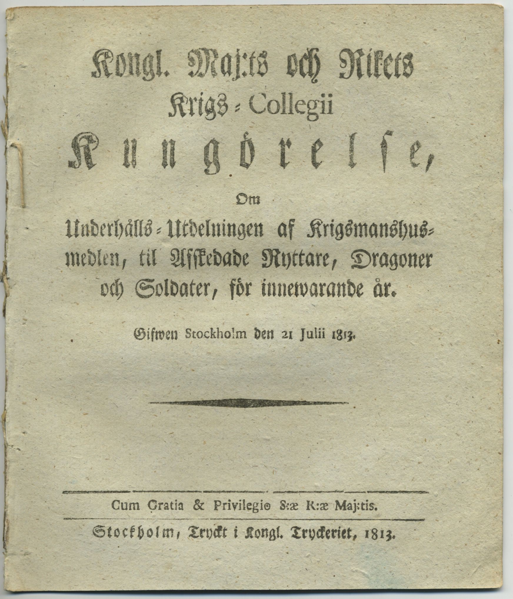 Kongl. maj:ts och rikets Krigs-collegii kungörelse, om underhålls-utdelningen af krigsmanshusmedlen, til afskedade ryttare, dragoner och soldater, för innewarande år. Gifwen Stockholm den 21 julii 1813.