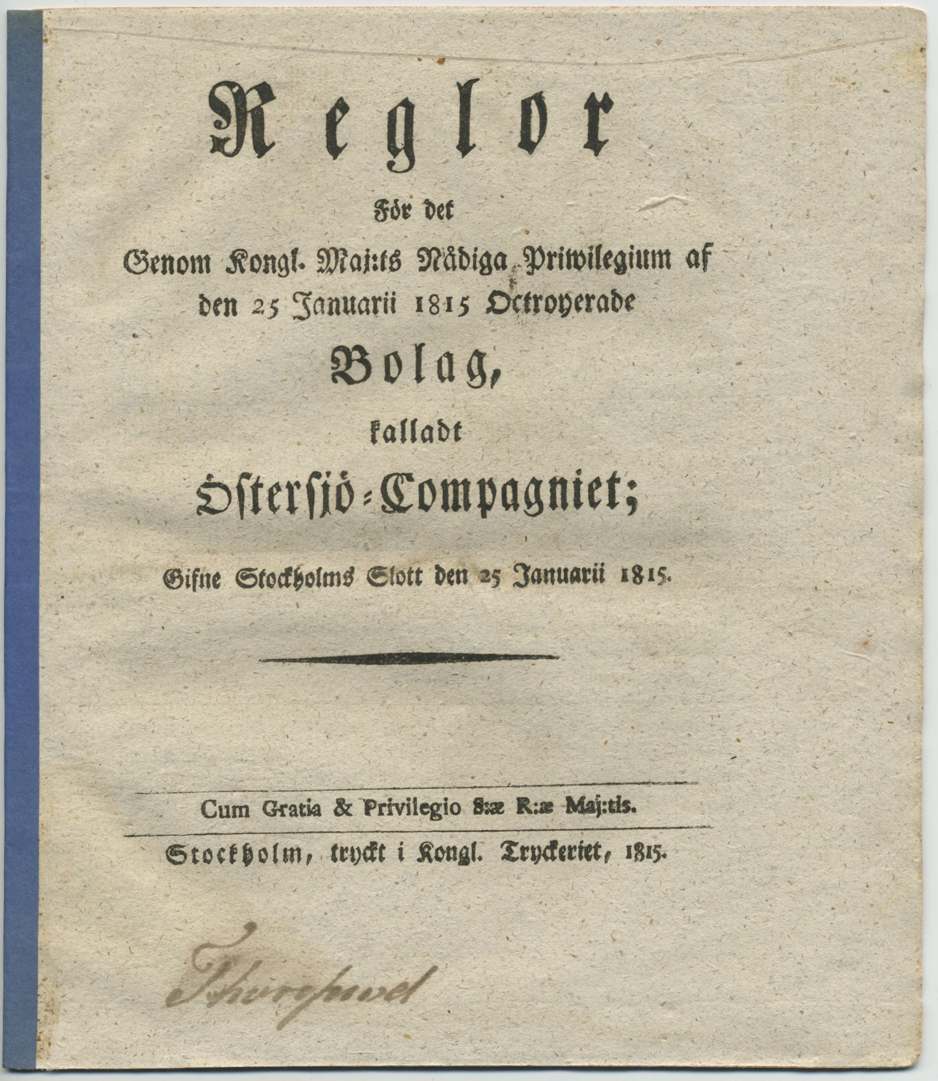Reglor för det genom kongl. maj:ts nådiga priwilegium af den 25 januarii 1815 octroyerade bolag, kalladt Östersjö-compagniet; gifne Stockholms slott den 25 januarii 1815.