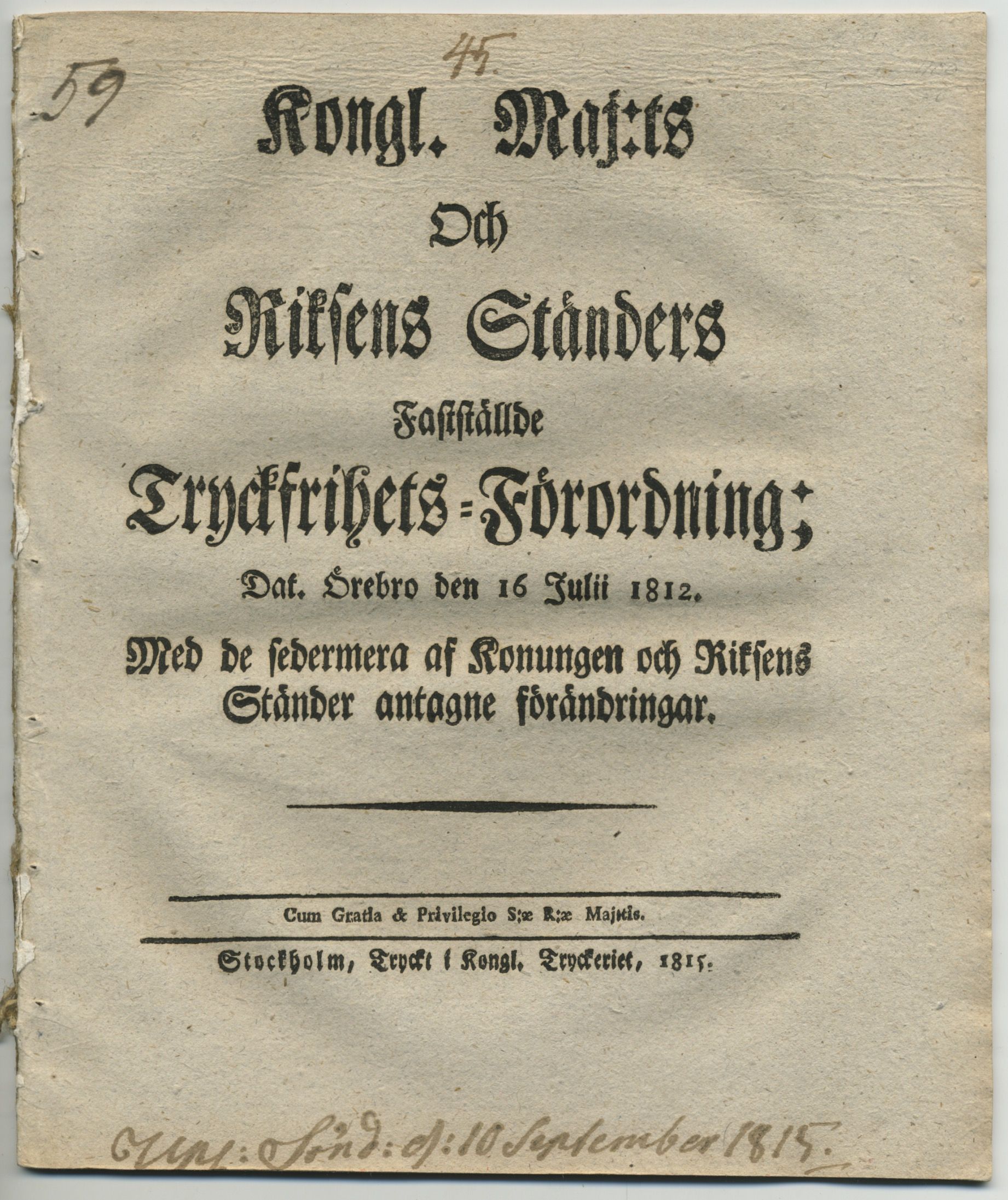 Kongl. maj:ts och riksens ständers fastställde tryckfrihets-förordning; dat. Örebro den 16 julii 1812. Med de sedermera af konungen och riksens ständer antagne förändringar.