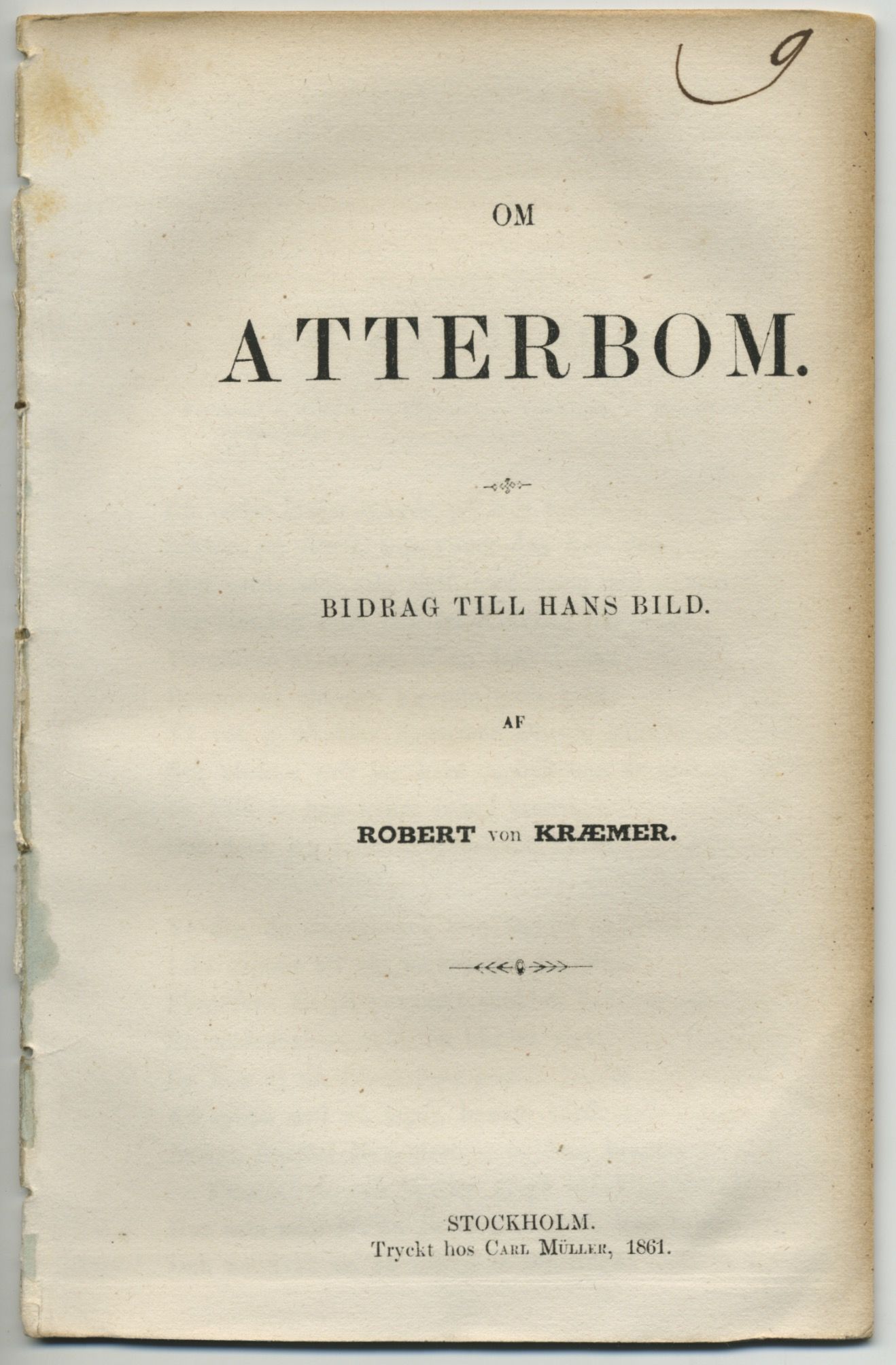 Sthlm, C. Müller, 1861. 8:o. (2),16,(1 blank,1) s. Tagen ur band. Gamla stänkta snitt. Lite bruntonad i yttermarginalen. Två större lagerfläckar på s. 1. Titelbladet med samtida numrering upptill: ”9”.”