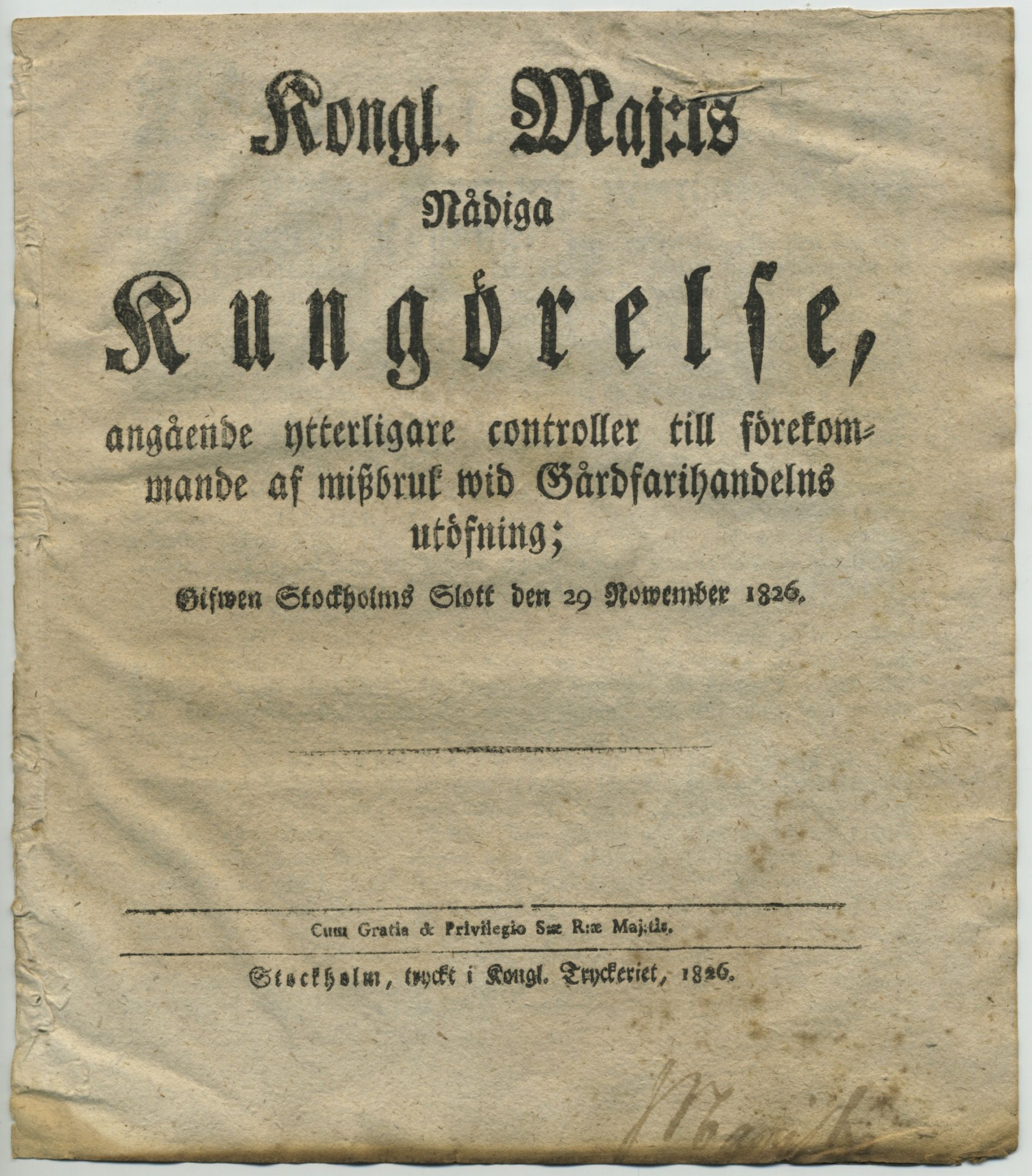 Kongl. maj:ts nådiga kungörelse, angående ytterligare controller till förekommande af missbruk wid gårdfarihandelns utöfning; gifwen Stockholms slott den 29 nowember 1826.