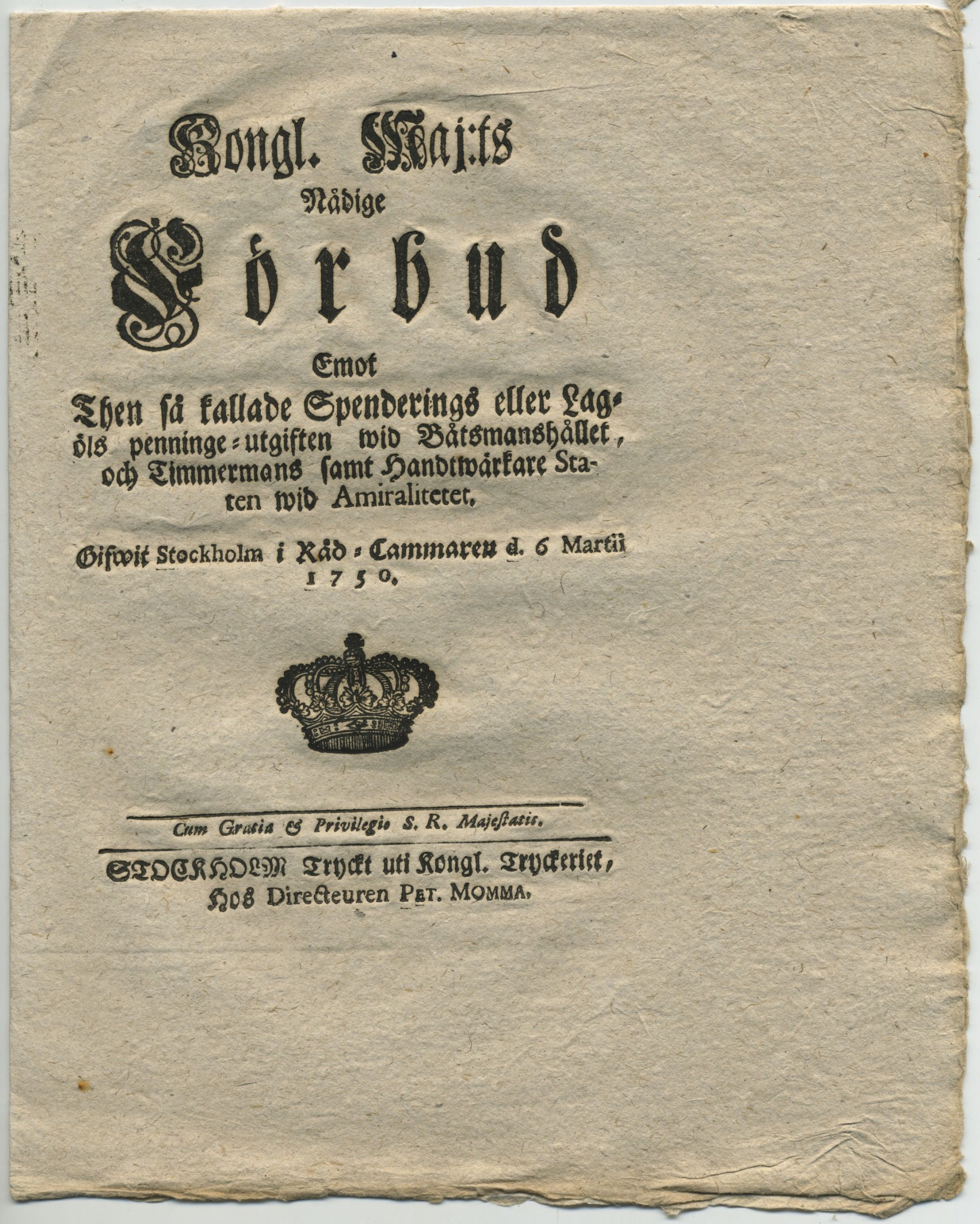 Kongl. maj:ts nådige förbud emot then så kallade spenderings eller lagöls penninge-utgiften wid båtsmanshållet, och timmermans samt handtwärkare staten wid Amiralitetet. Gifwit Stockholm i råd-cammaren d. 6 martii 1750.