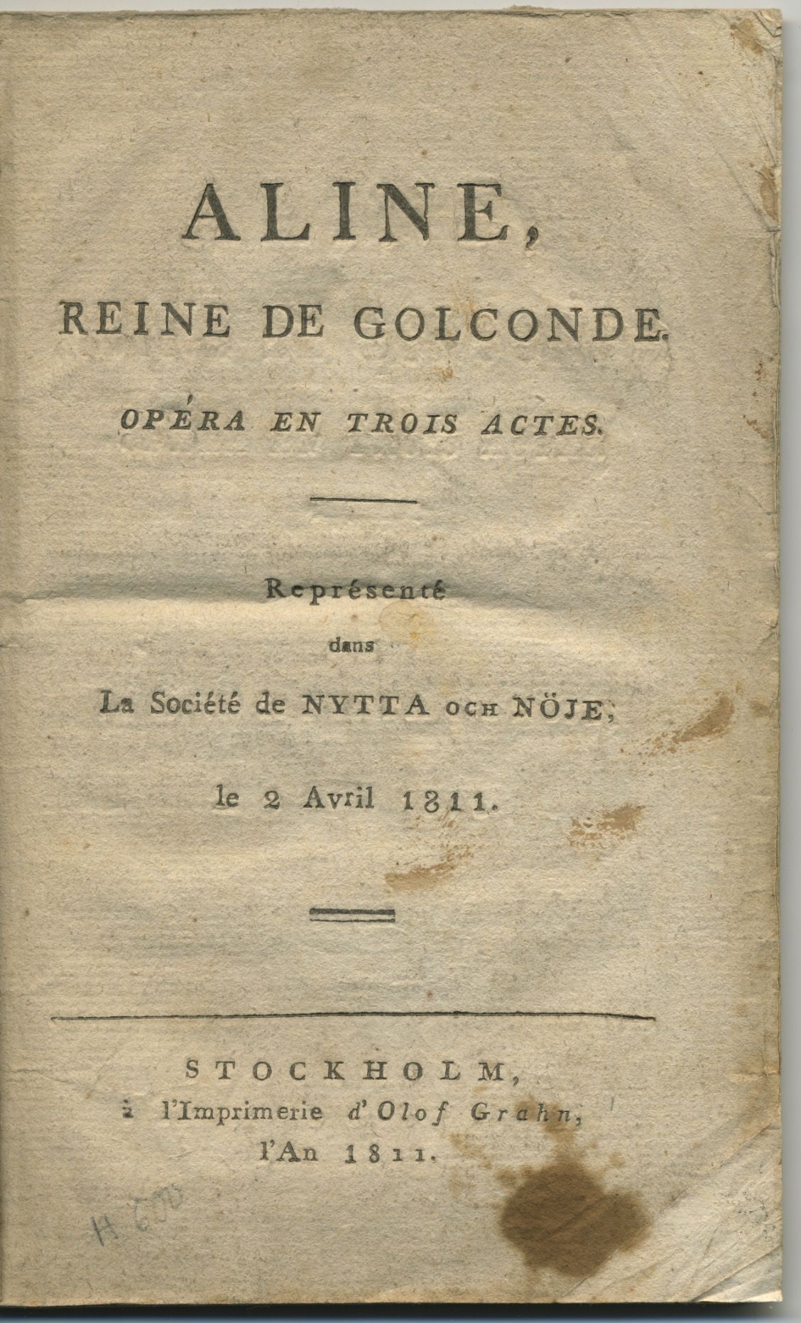 Aline, reine de Golconde. Opéra en trois actes. Représenté dans la société de Nytta och nöje, le 2 avril 1811.