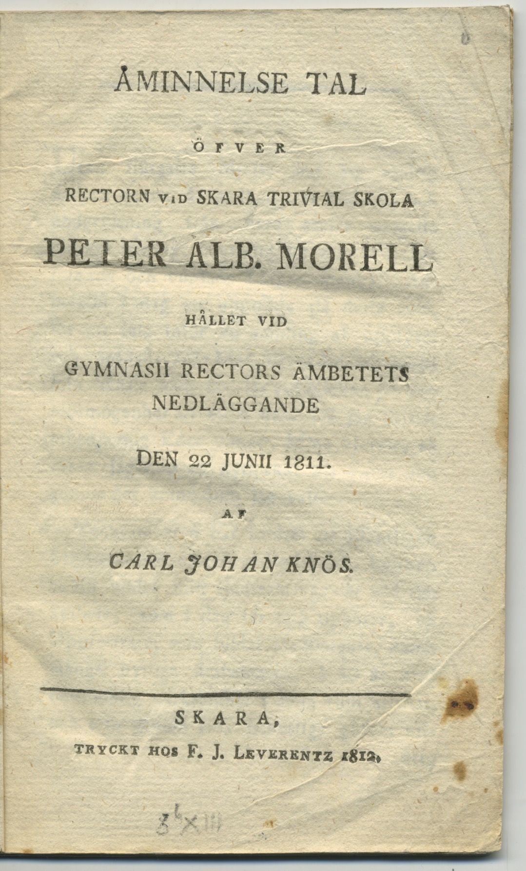 Åminnelse tal öfver rectorn vid Skara trivial skola Peter Alb. Morell hållet vid gymnasii rectors ämbetets nedläggande den 22 junii 1811.