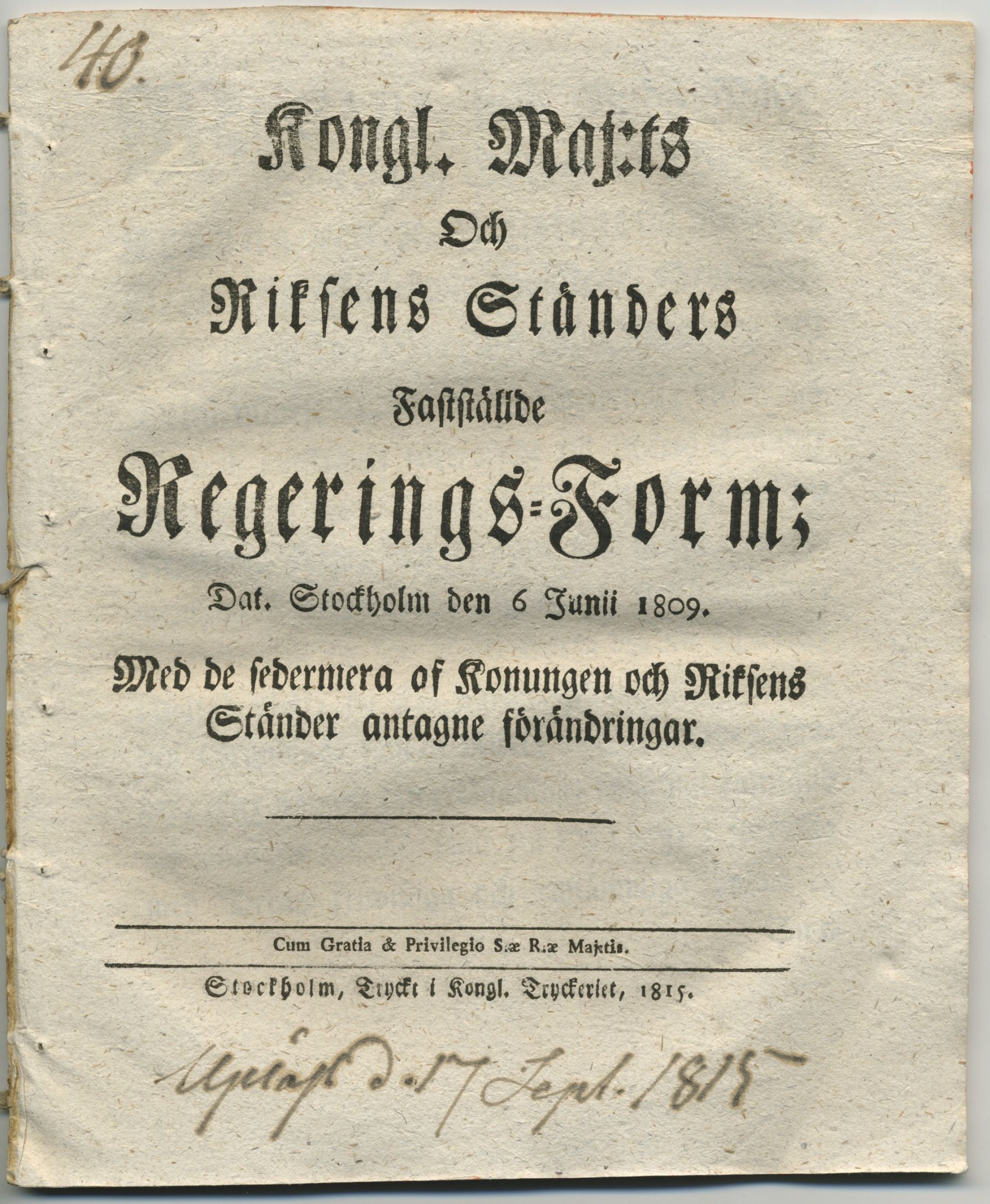 Kongl. maj:ts och riksens ständers fastställde regerings-form; dat. Stockholm den 6 junii 1809. Med de sedermera af konungen och riksens ständer antagne förändringar.