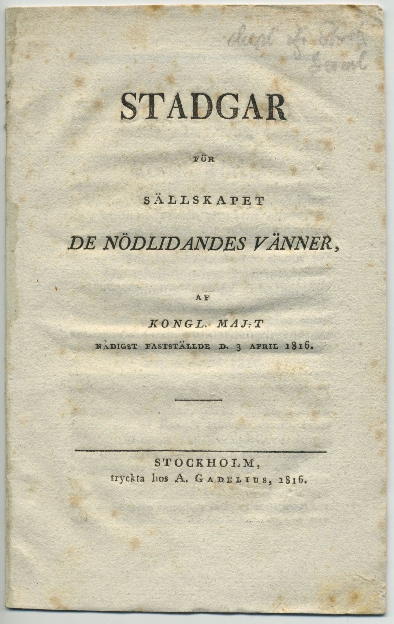 Stadgar för Sällskapet de nödlidandes vänner, af kongl. maj:t nådigst fastställde d. 3 april 1816.