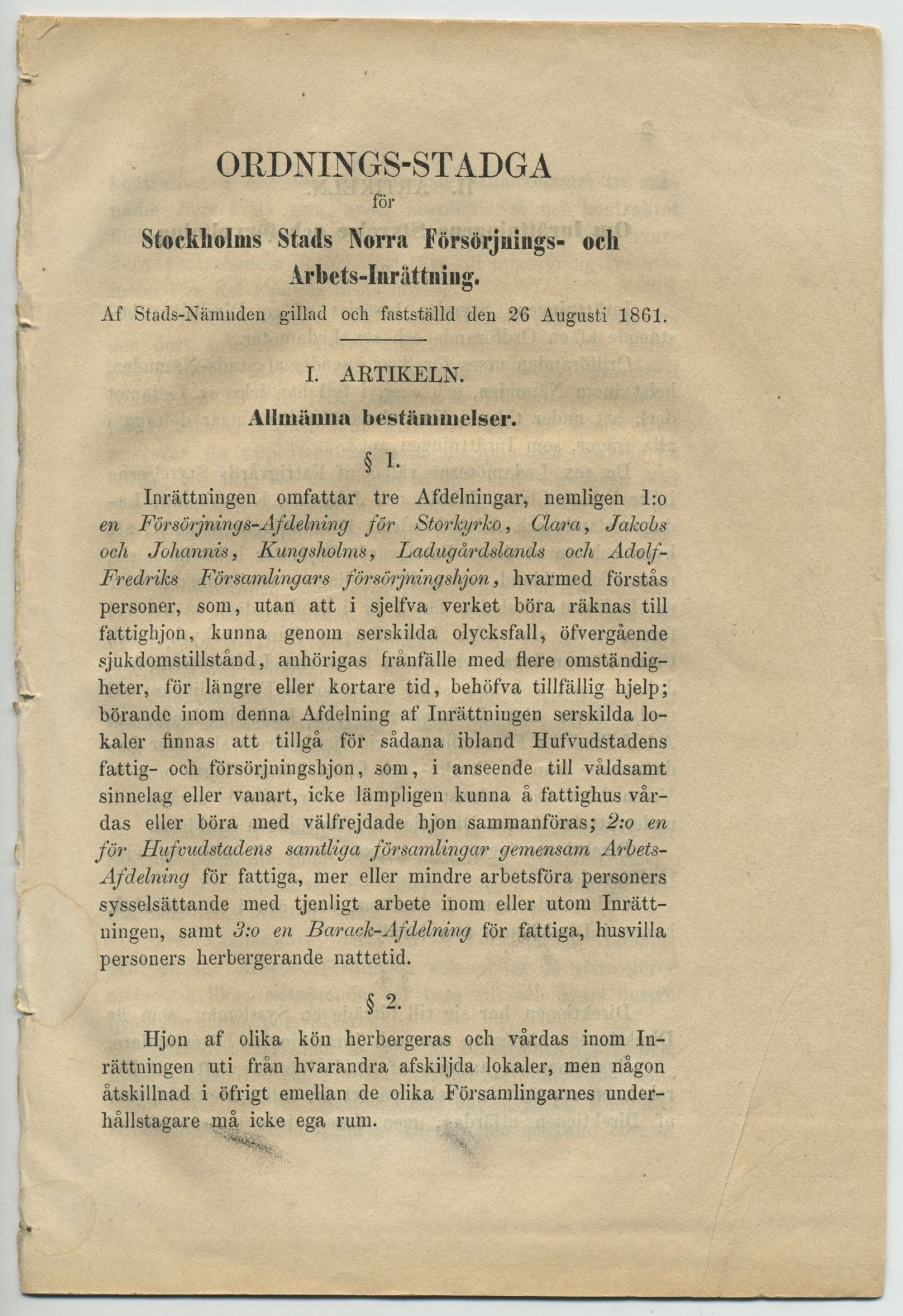 Ordnings-stadga för Stockholms stads norra försörjnings- och arbets-inrättning. Af stads-nämnden gillad och fastställd den 26 augusti 1861. [=rubrik].