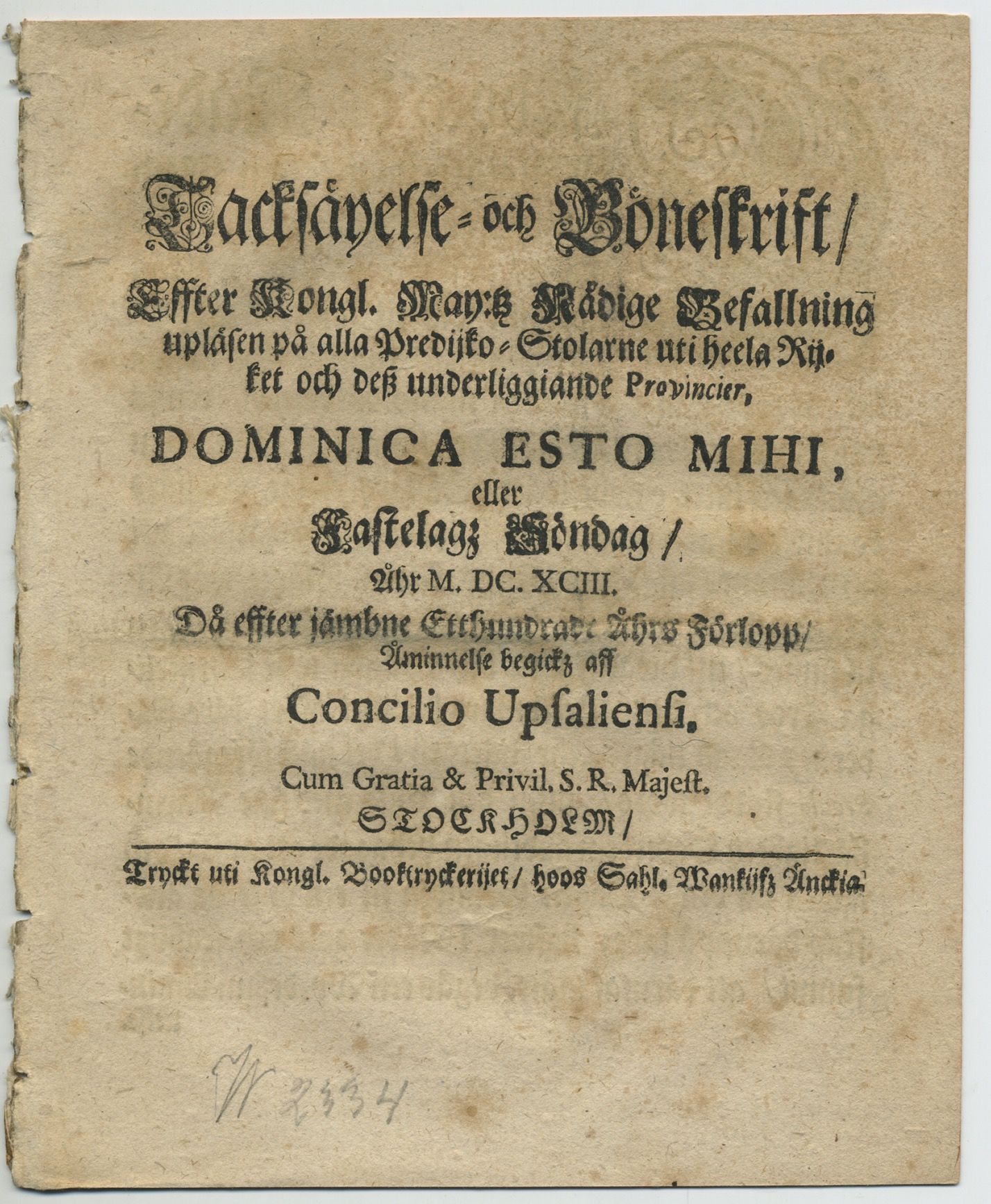 Tacksäyelse- och böneskrift/ effter kongl. may:tz nådige befallning upläsen på alla predijko-stolarne uti heela rijket och dess underliggiande provincier, dominica esto mihi, eller fastelagz söndag/ åhr M. DC. XCIII. då effter jämbne etthundrade åhrs förlopp/ åminnelse begickz aff Concilio Upsaliensi.