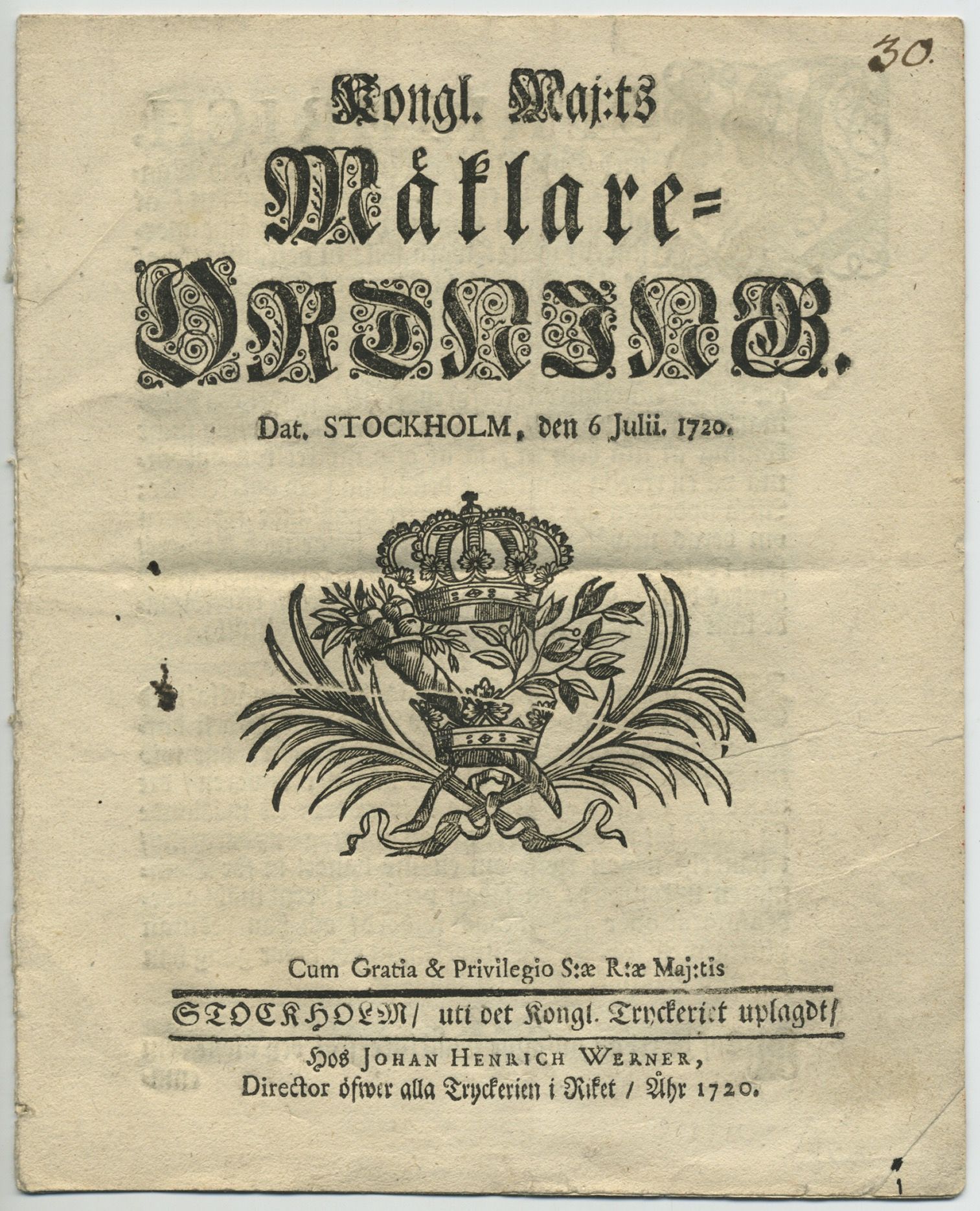 Kongl. maj:ts mäklare-ordning. Dat. Stockholm, den 6 julii 1720.